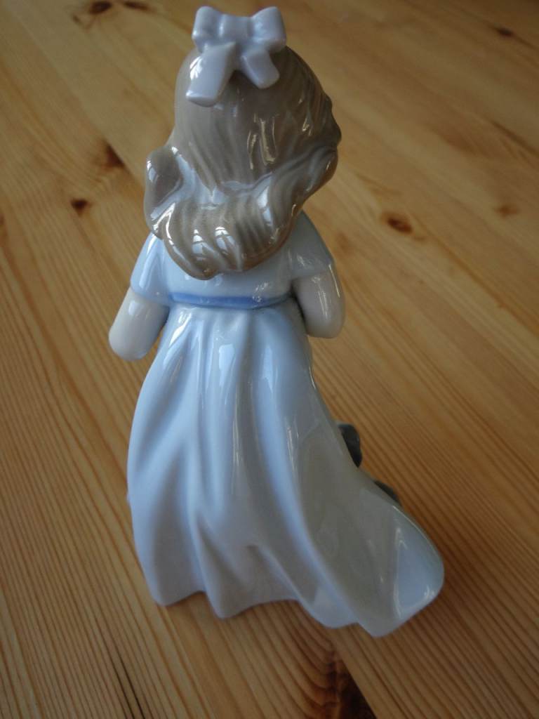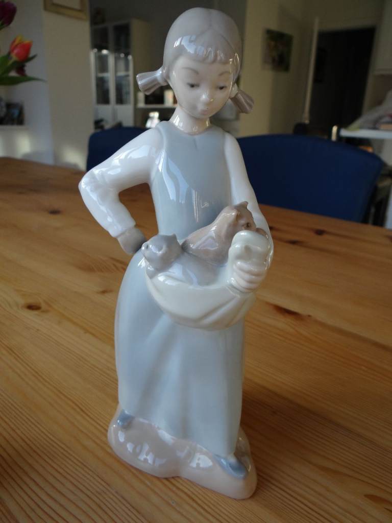 These two NAO LLadro figurines are very cute and in perfect condition The first is Daisa Girl Running With puppy dog 1987 Spain 6 1/2" - Blue Dress the second is "Girl carrying Kittens" which is 9 inches in height.