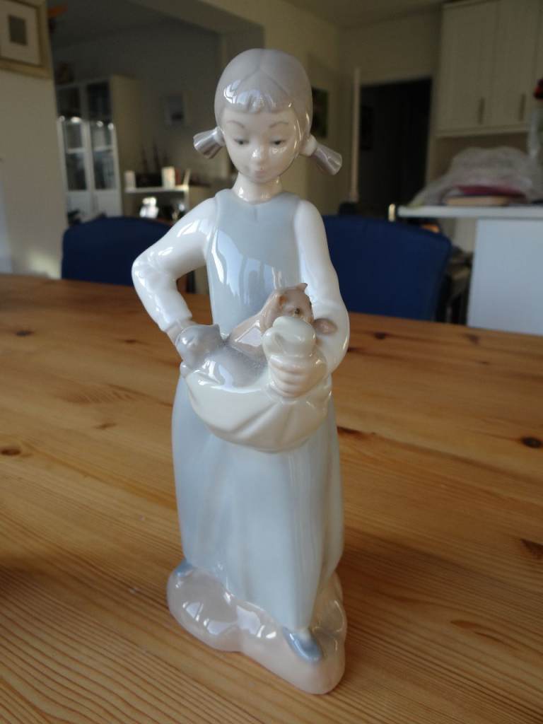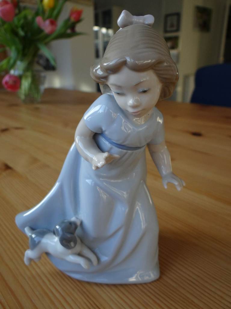 Posting for 8+ yearsTwo perfect Nao Lladro Vintage figurines 1. girl running with a puppy 2. girl carrying kittens