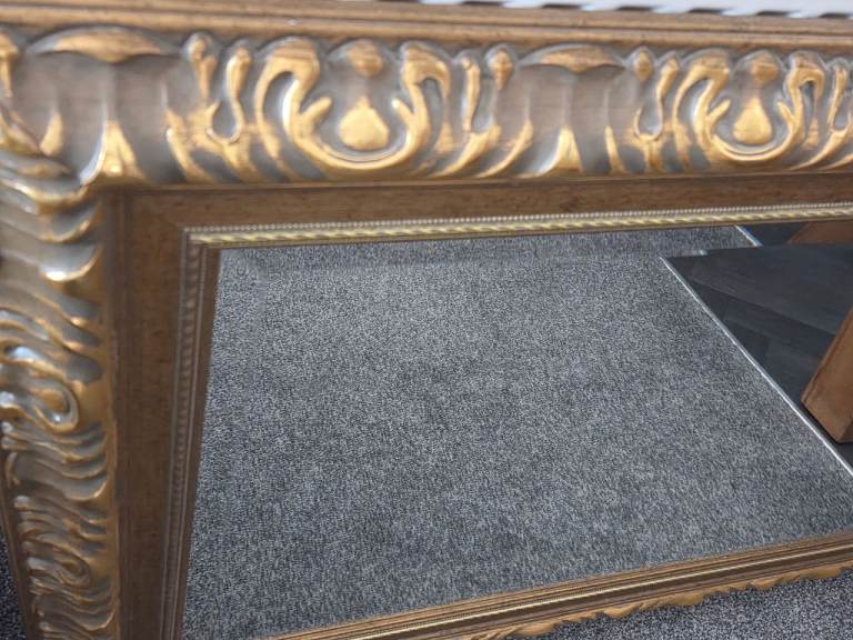 This is a grand mirror which would be lovely in a hall or over the fire place. Measures approximately width 35 inches 89- 90cms and height 27.5 inches 70 cms. Can be hung vertically or horizontal. Please look at pictures. NO WASUP PHONE OR TEXT ONLY.
