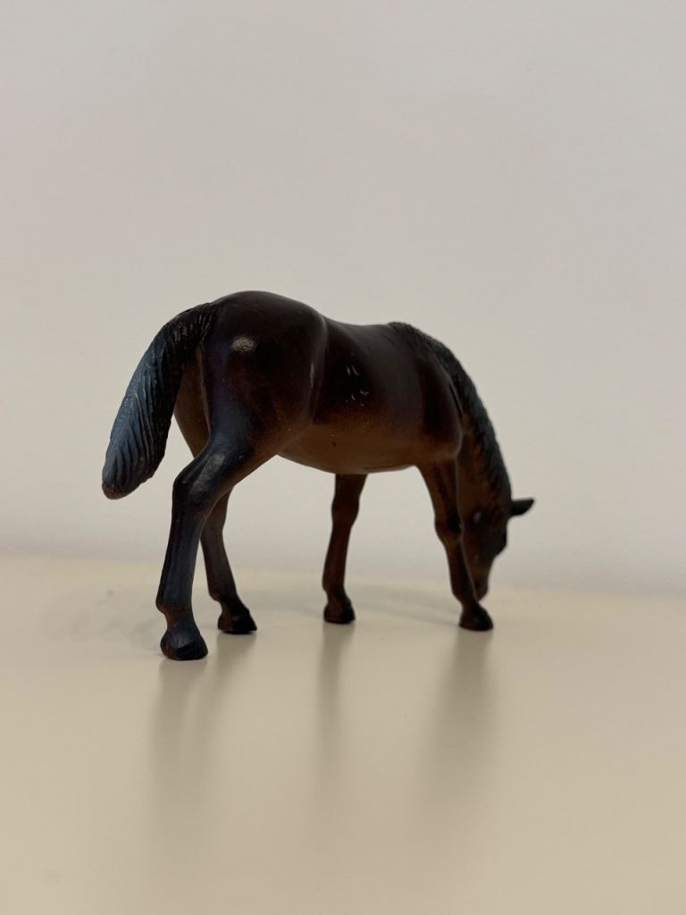 Beautifully detailed model horse in a natural grazing pose. This figure features a deep bay coat with subtle muscle definition and a textured mane and tail, making it a perfect addition to any model horse collection or as a standalone display piece.
