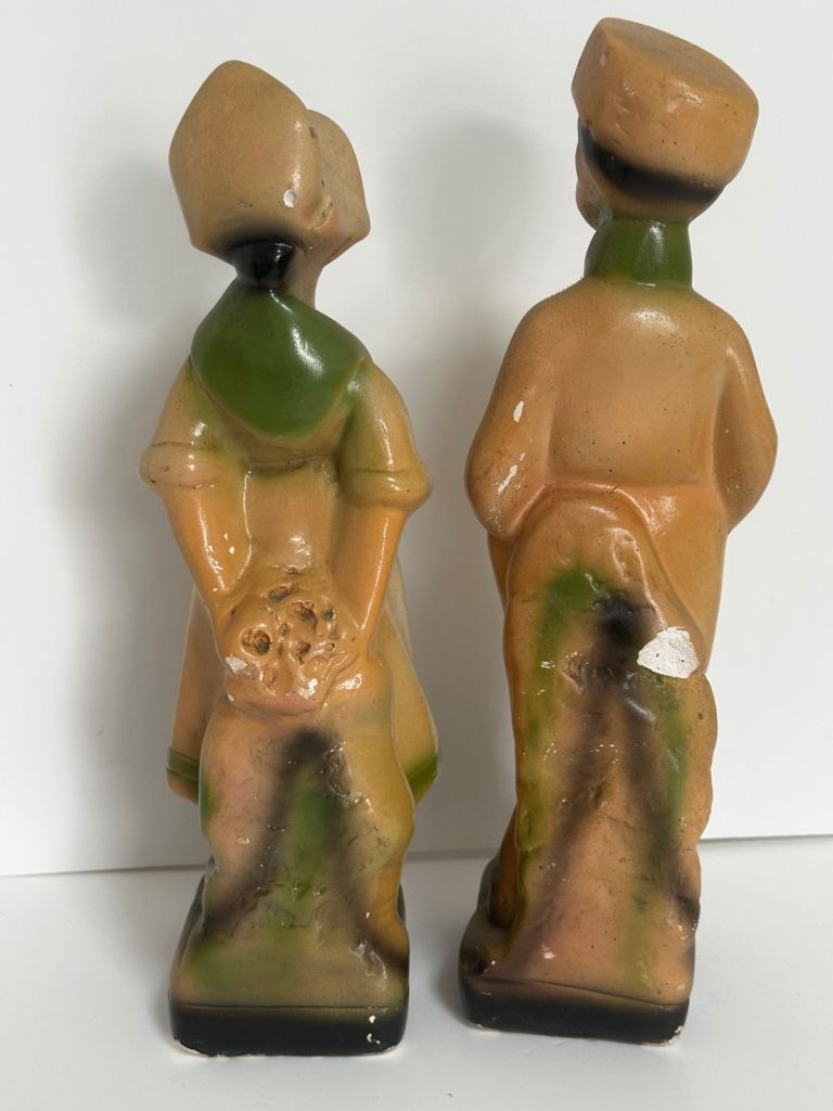 a pair of decorative Dutch figures chalkware, some marks and chips but the figures have been well-loved and handled over time, which is consistent with their age and material. The figures are charming and elegant, with a rich history that adds to their beauty.