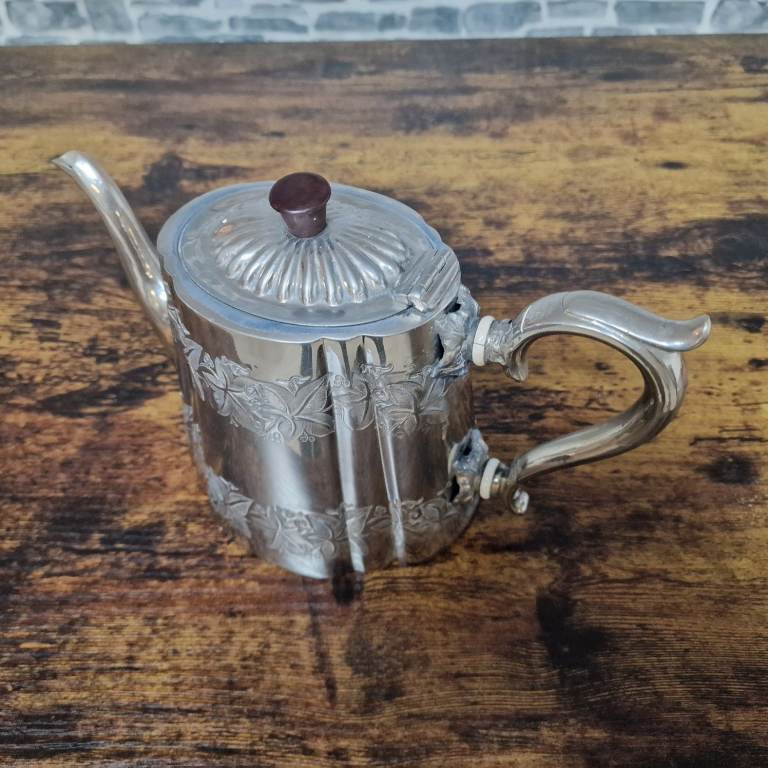 A decorative vintage silver-plated teapot featuring an elegant floral engraved design around the body, a shaped spout, and a curved handle. The hinged lid opens and closes smoothly and retains its original finial, giving the piece plenty of character and charm.