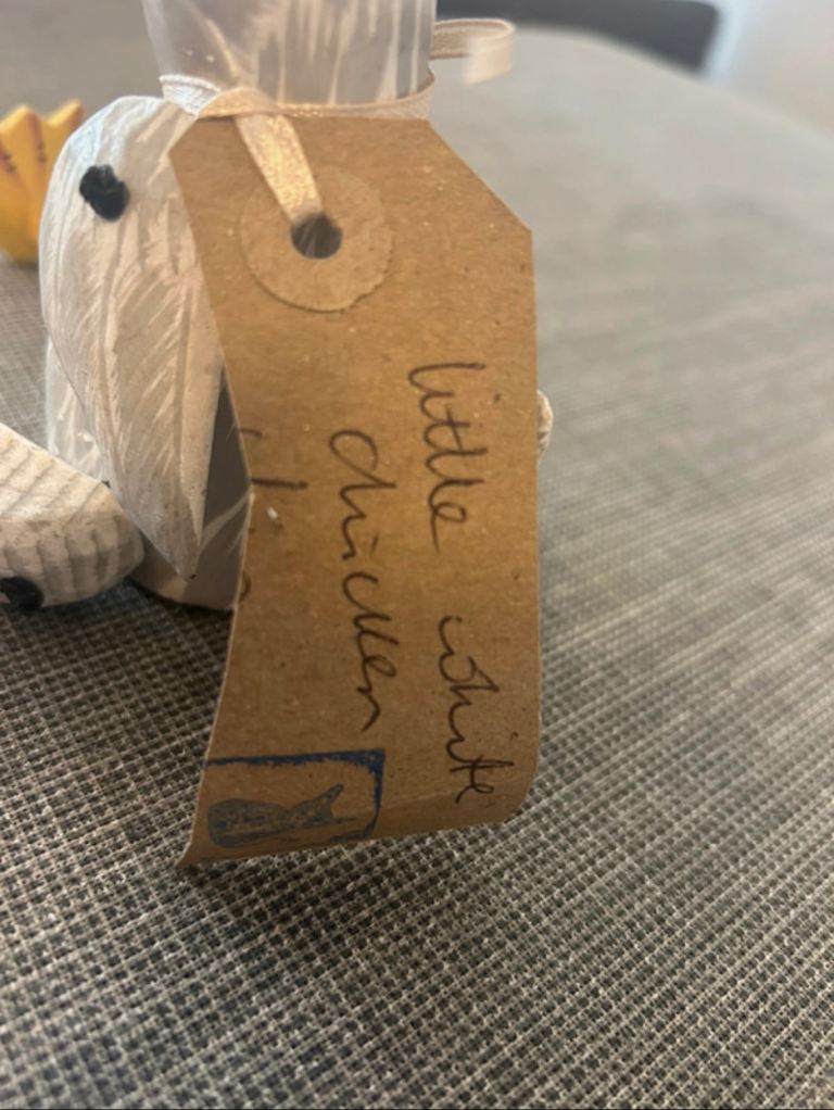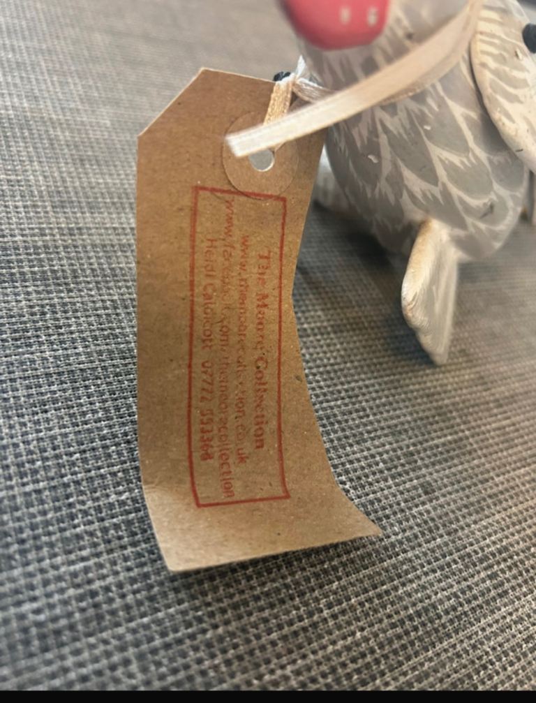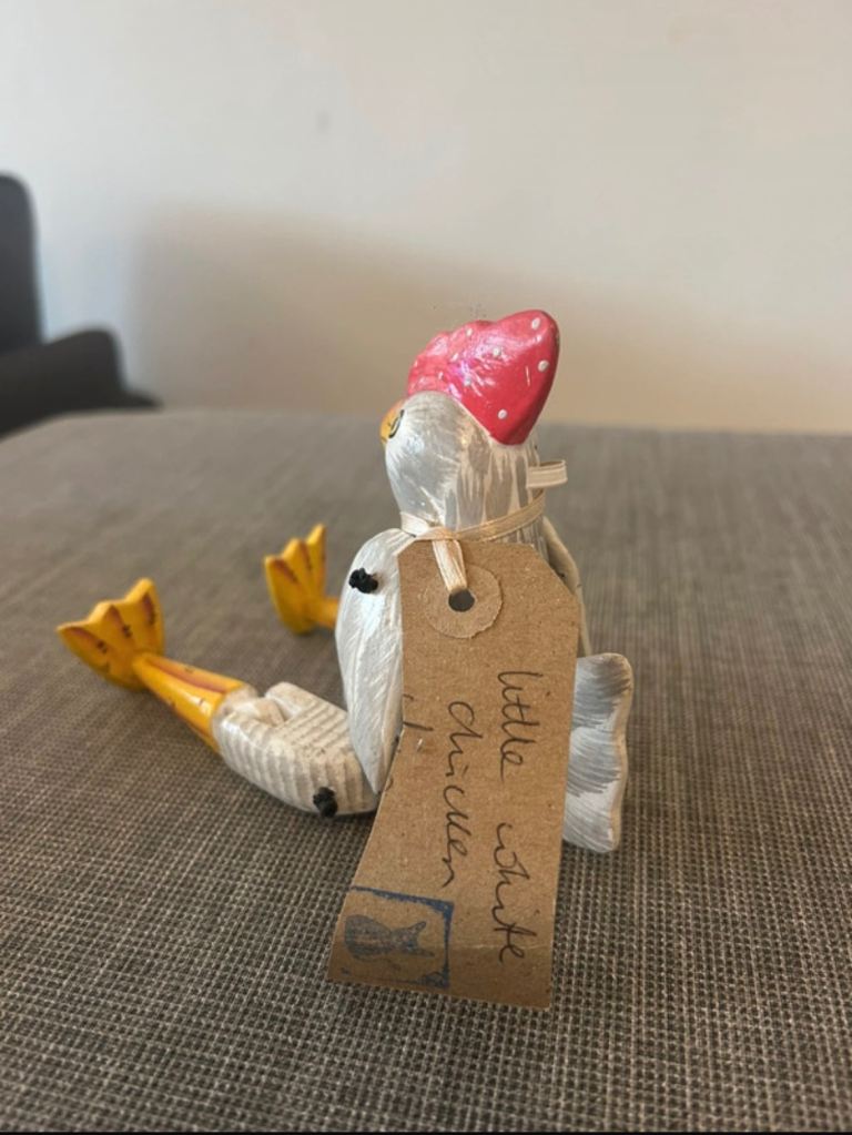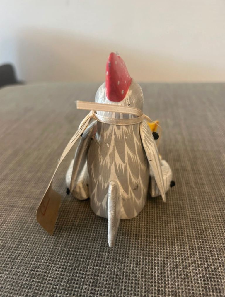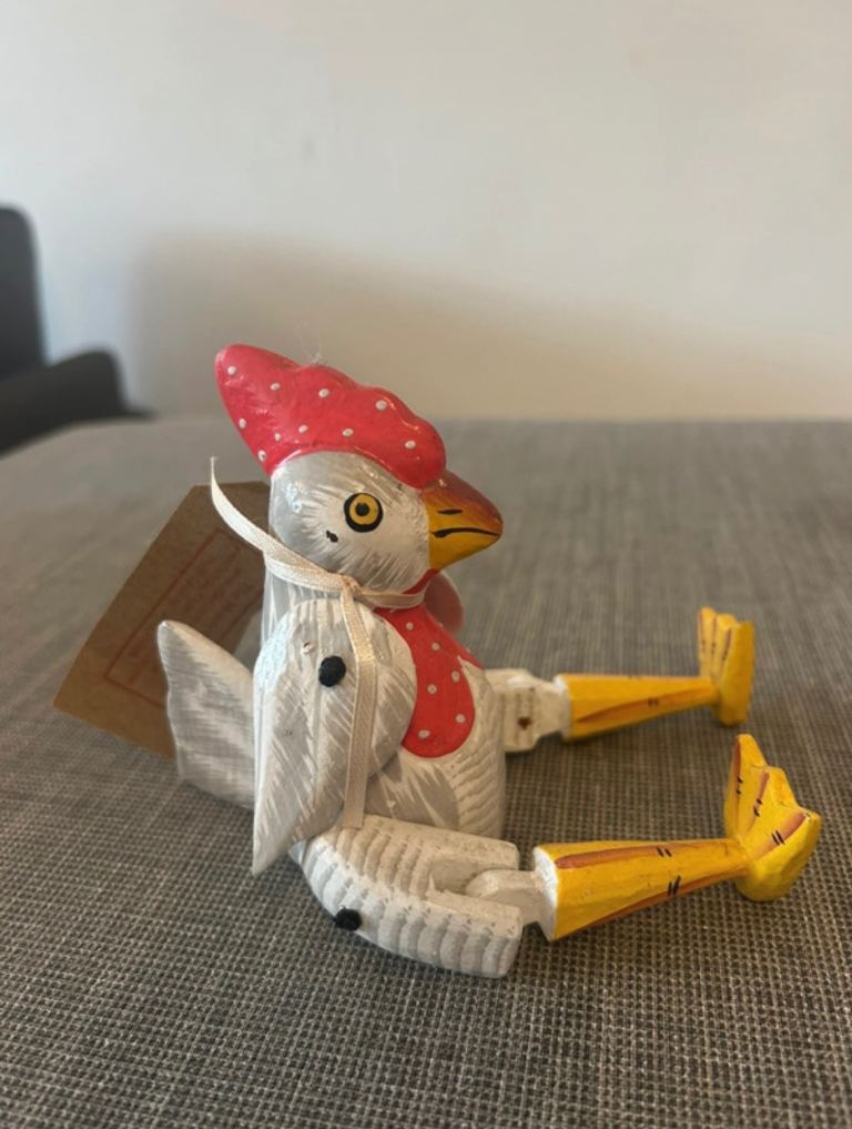 Hand carved and hand painted wooden chicken ornament with articulated legs. Folk style decorative piece from The Moore Collection with original label attached.