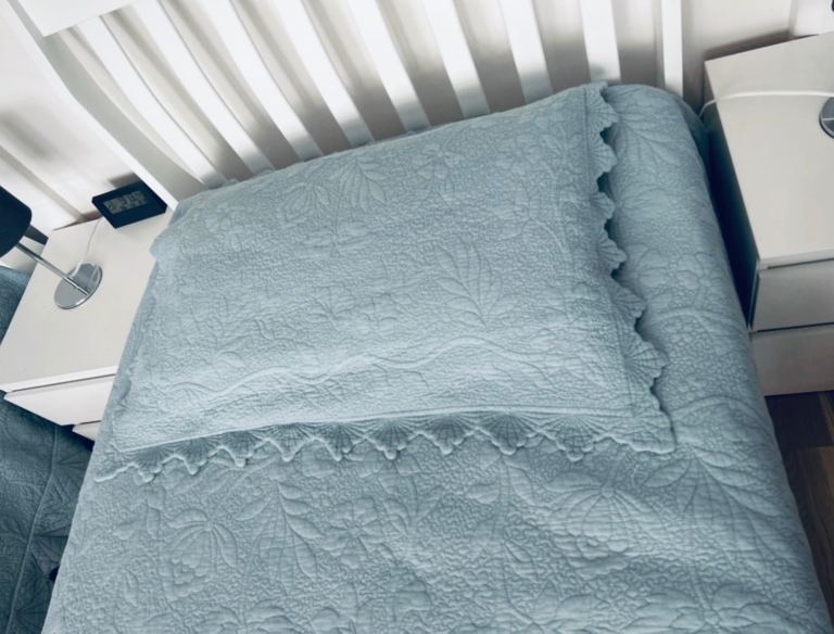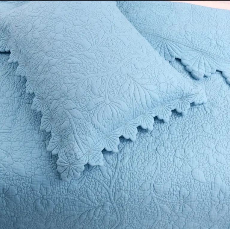 This light blue bedspread and pillow cover set is made from 100% cotton, making it soft, breathable, and comfortable for a bedroom setting. The bedspread measures 170 x 200 cm, perfect for a standard single bed. The calming blue colour adds a touch of tranquillity to the bedroom decor, creating a relaxing atmosphere for a good night's sleep. Ideal for adding a fresh and clean look to your bedroom, this set is a stylish and practical addition to any home.