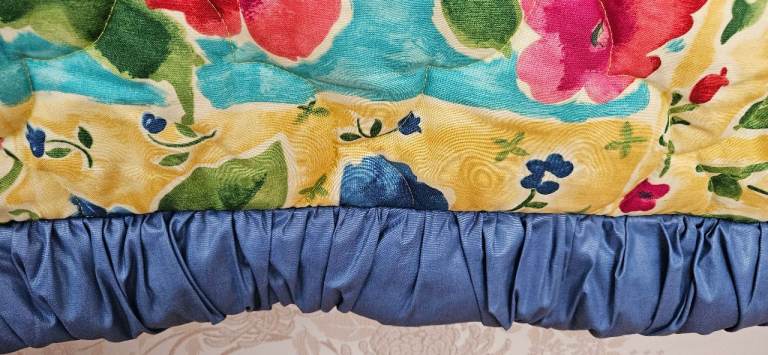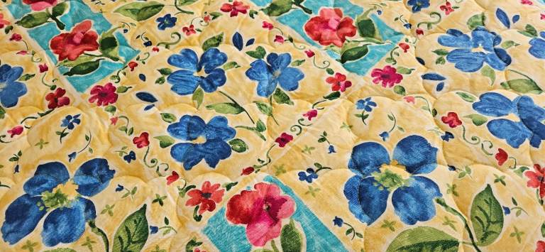 Luxury, professionally-made bed quilt. The photos show the quilt on a double bed but it would be equally suitable for a single bed. Quilt size approximately 300L x 230W. This has only been on a spare bed and is in very good condition and from a smoke-free home.