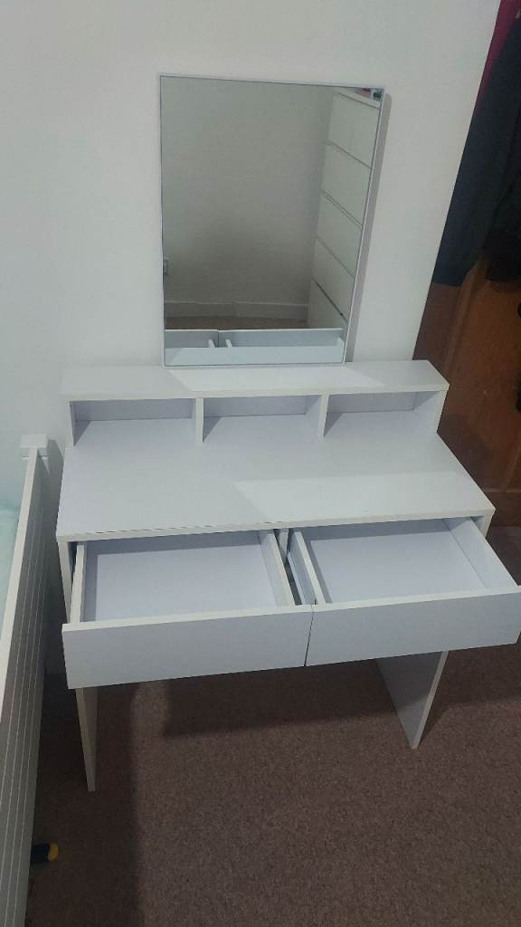 WAYFAIR vanity table, in good condition. Has 2 drawers and 3 compartments for storing make up items and a good sized mirror.