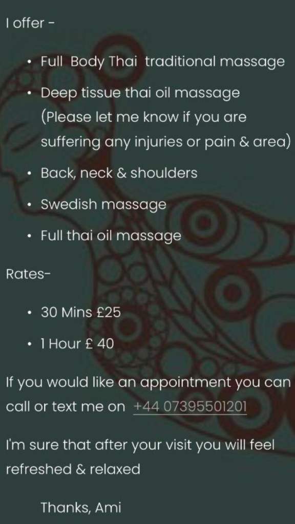 My name’s Ami and I’m a professional Thai Massage Therapist with over 8 years of experience; available to offer comfort and relaxation to you! I have a vast knowledge about the human body's nervous system and muscle groups and my unique style and techniques bring all of that together, so you will feel the full benefit from my ability.