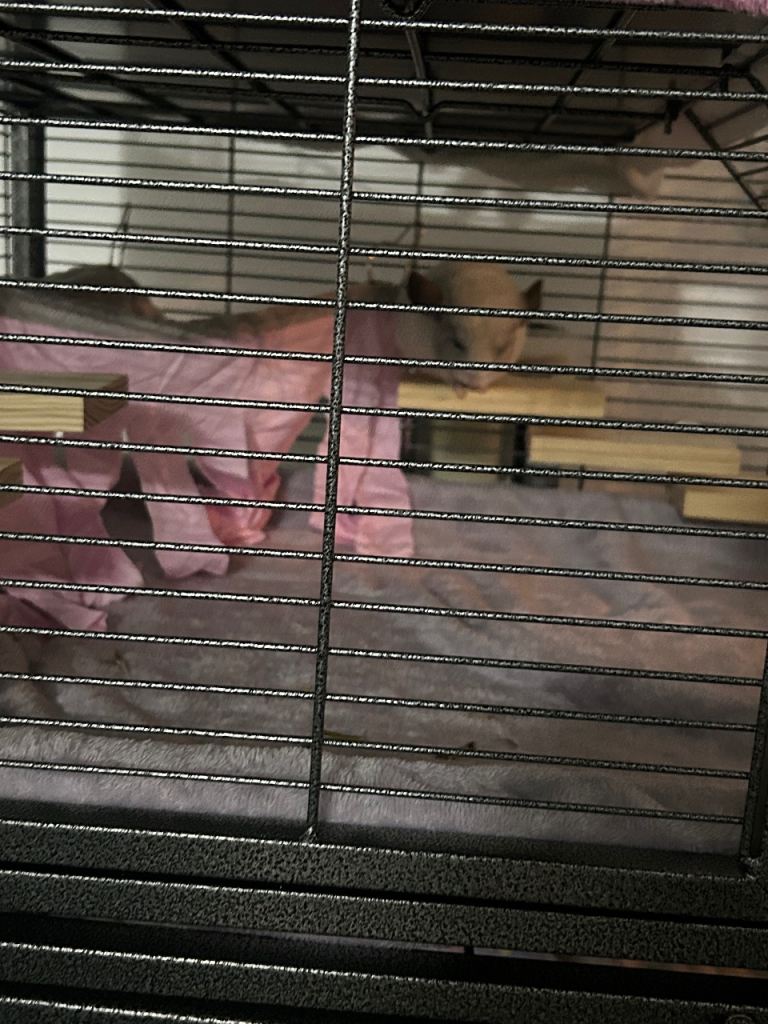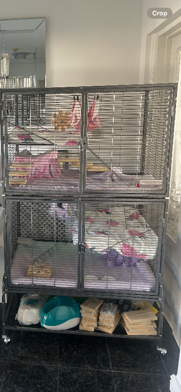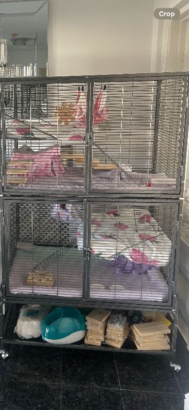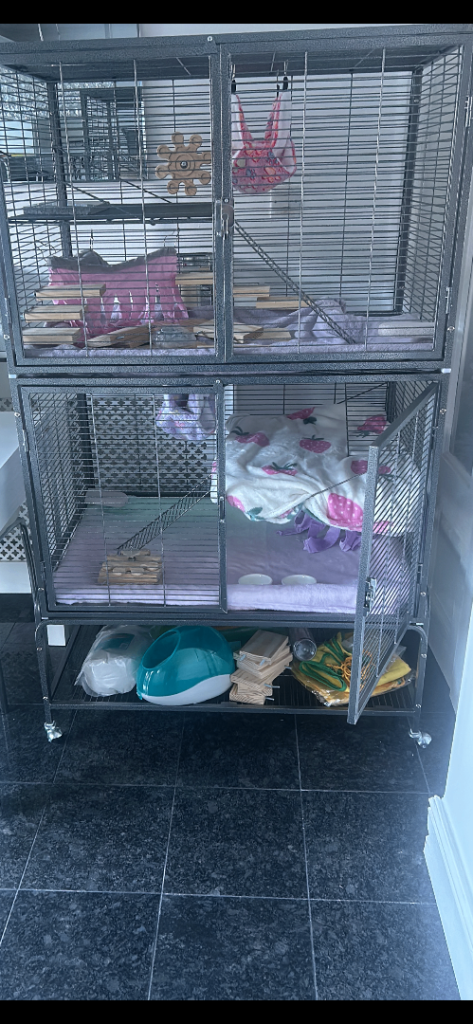 she comes with her 2 tier cage with front opening doors, top cage can be separated from bottom cage. Cage base has wheels for easy movable transport.