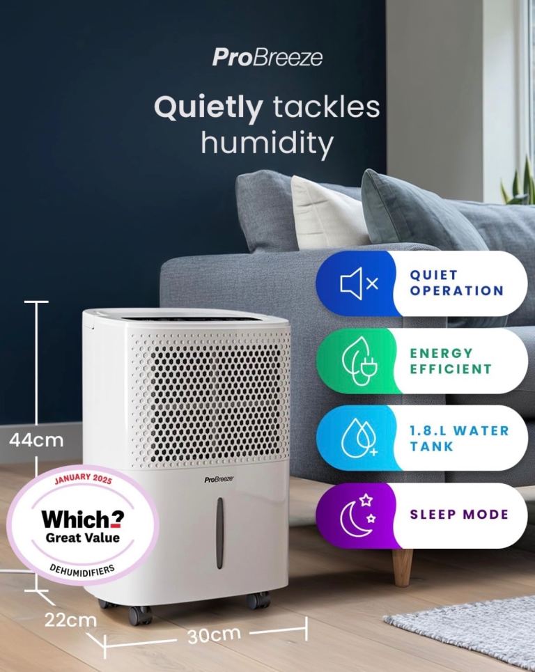 Pro Breeze® 12L/Day Dehumidifier with Automatic Humidity Sensor & Display, Sleep Mode, 24-hour Timer, Laundry Drying, Large Tank - WHICH? BEST BUY DEHUMIDIFIER AWARD