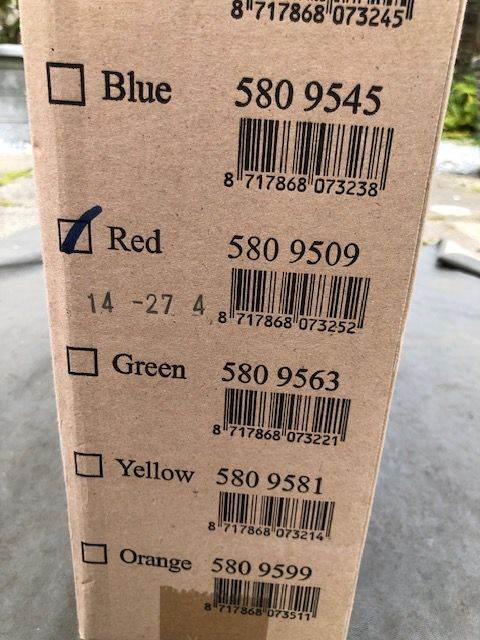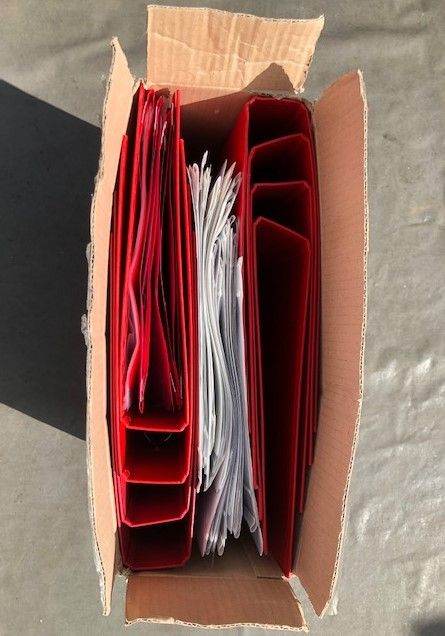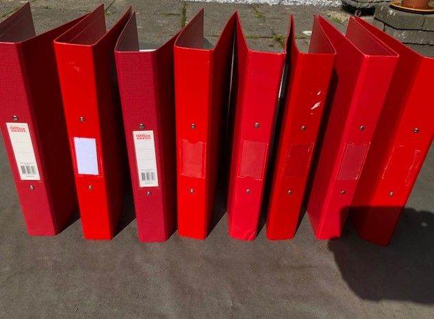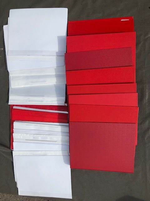There are 30 white soft shell flat bar A4 folders, 15 red soft shell flat bar A4 folders, and 8 red hard shell A4 ringbinders.