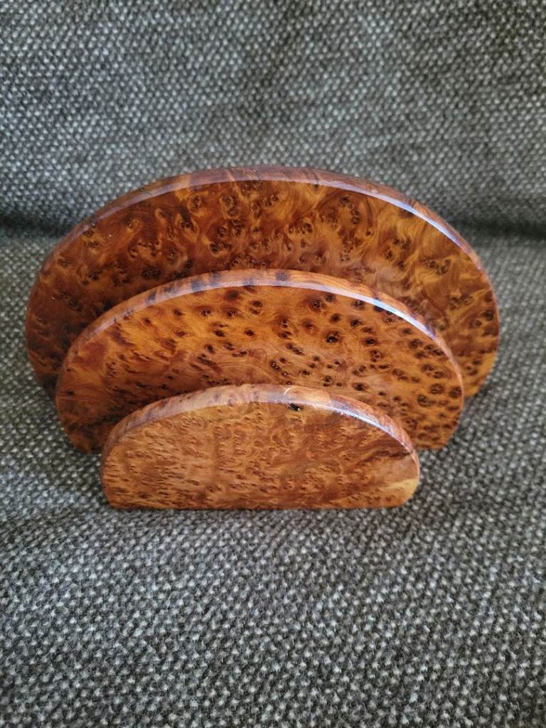 Beautiful Wooden Art Deco Style Walnut Burr Letter Holder, as new, never been used, bought for £35, paid £26 and stored ever since. 5 inches tall by 8 inches wide and 3 inches deep. £20 or thereabouts. Wareham.