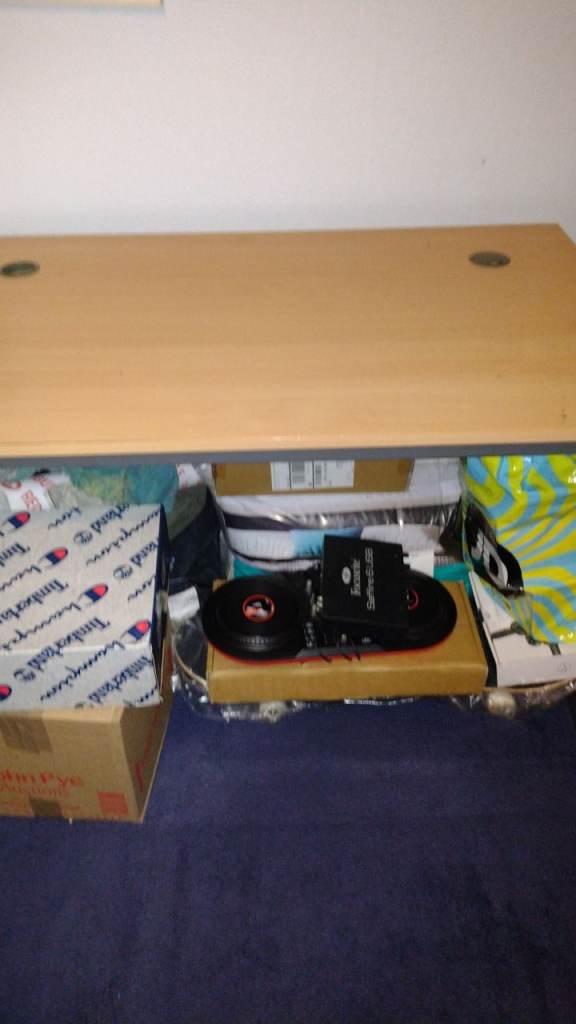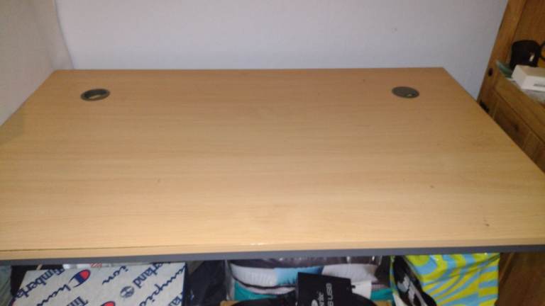 This is a teak colour study desk with two openings for cables on either side in mint condition good quality L48" x W 29.5 H 28" approx size