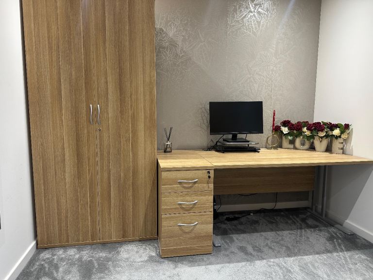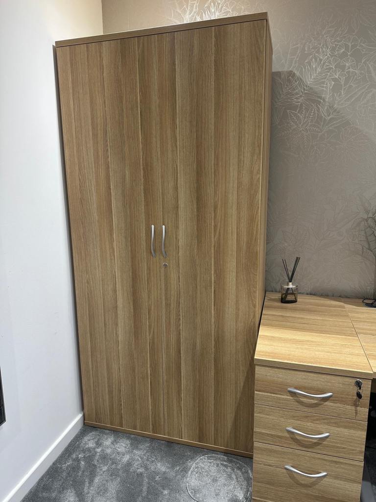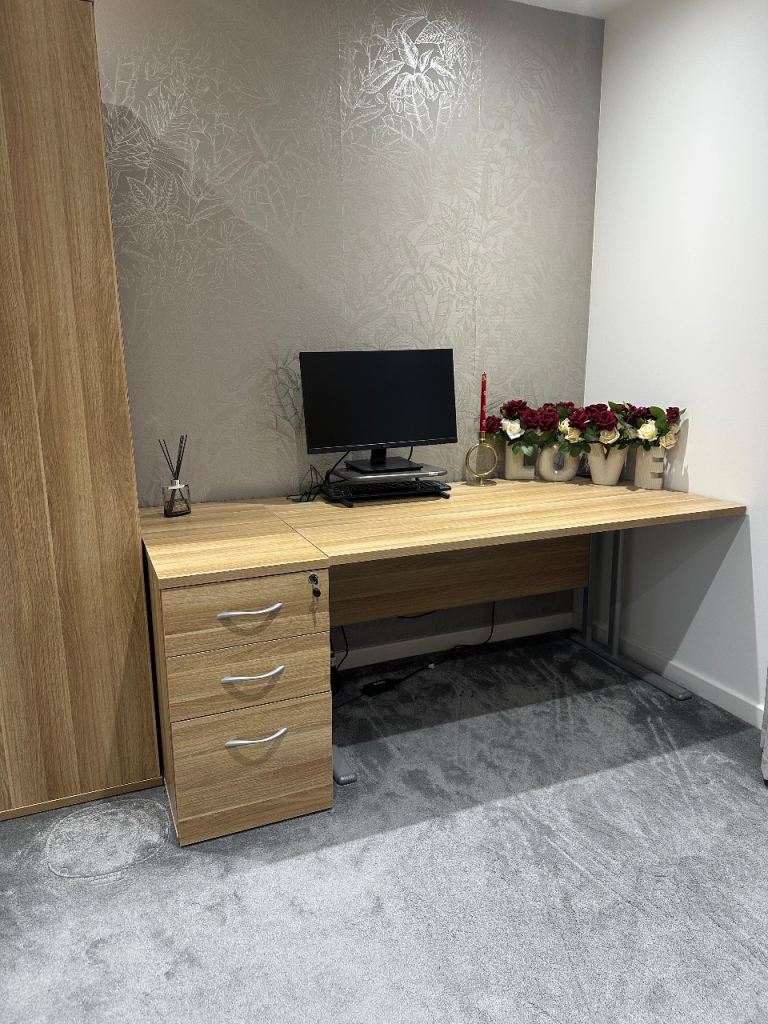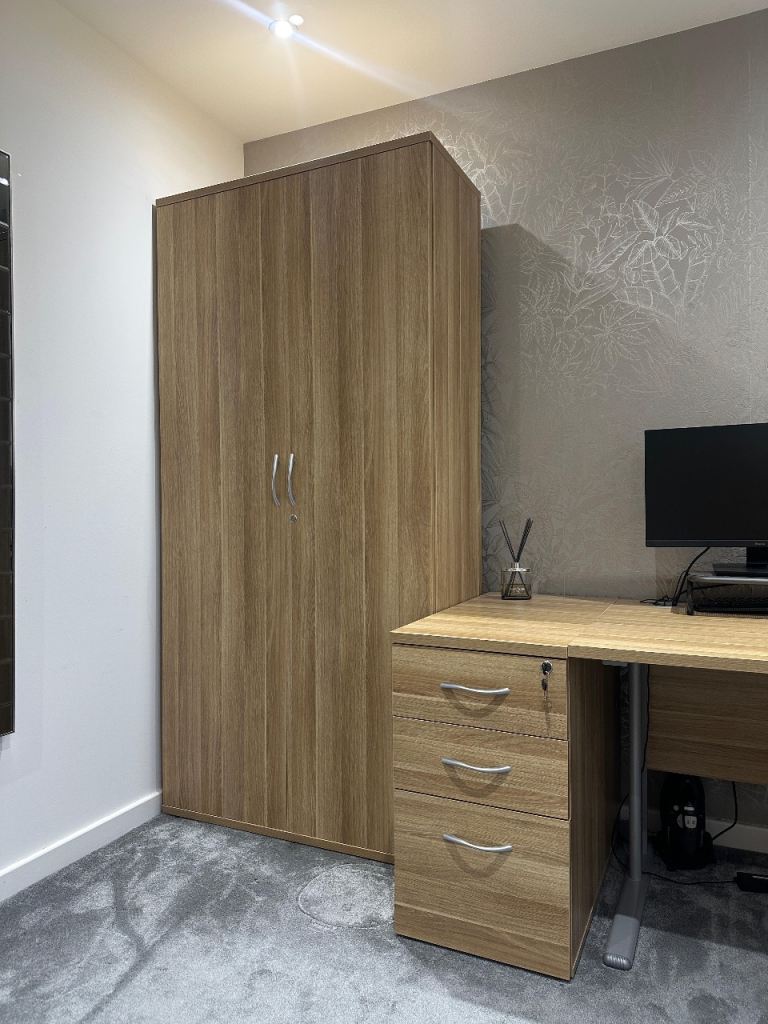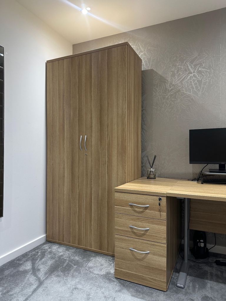 American Light Oak Cantilever Office Desk with Desk High Pedestal Bundle & Cupboard