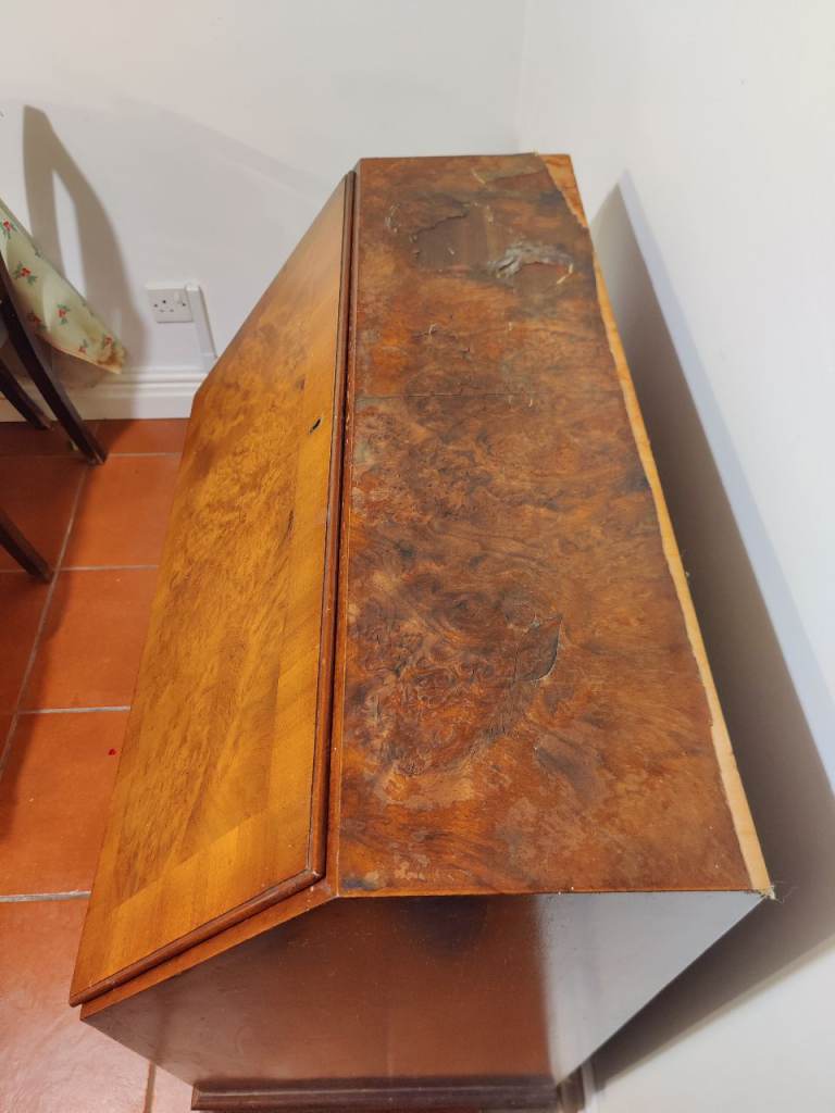 This beautiful little bureau is in structurally great condition, but is in need of some TLC along the top of the item where it has been damaged after years of use (see attached pictures).