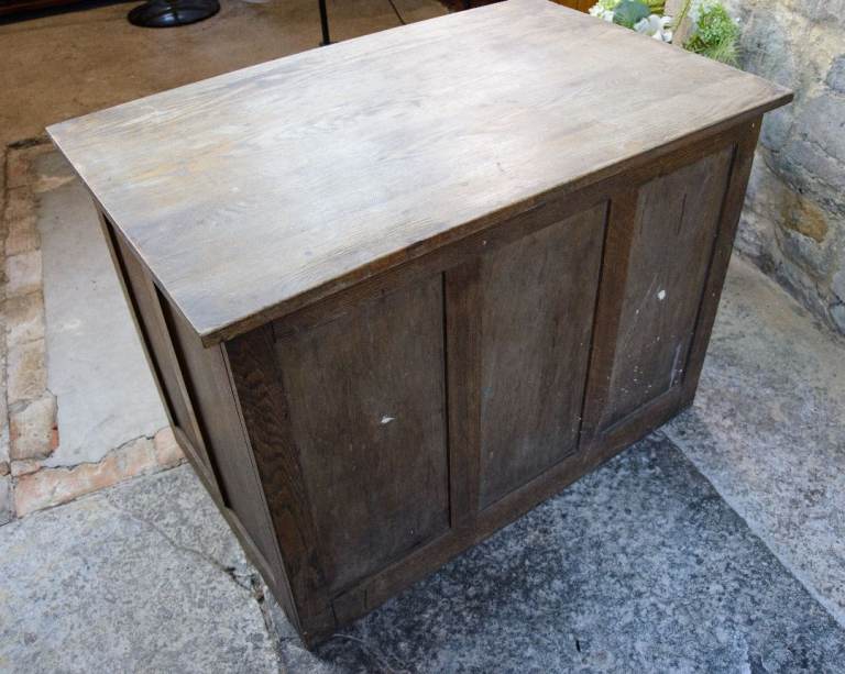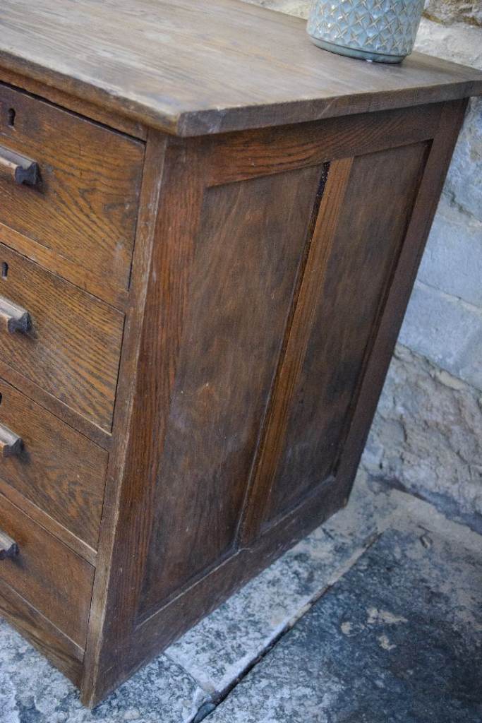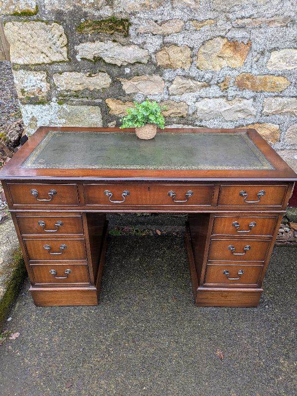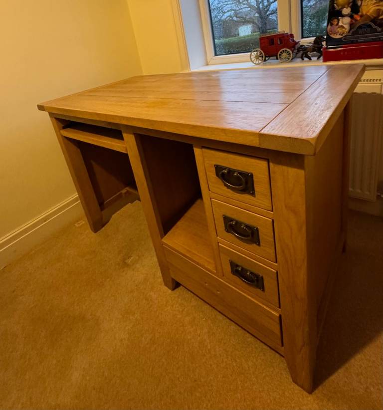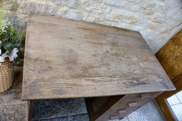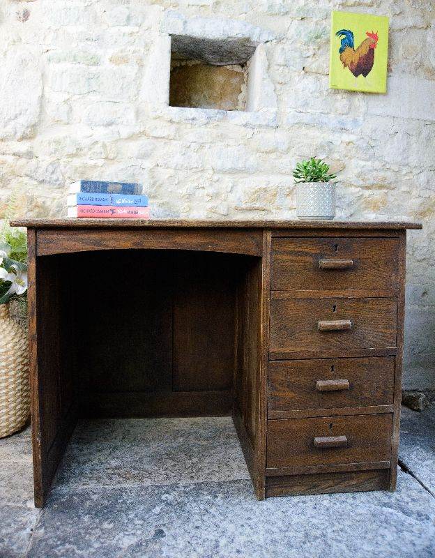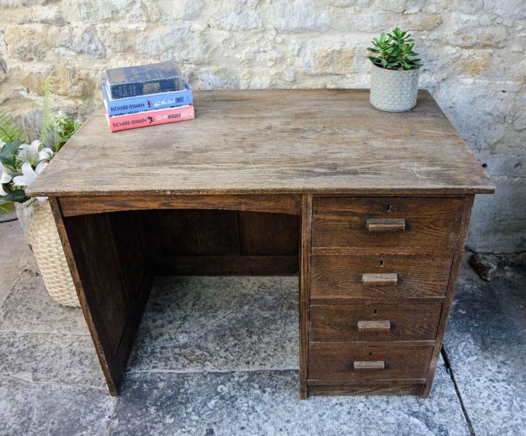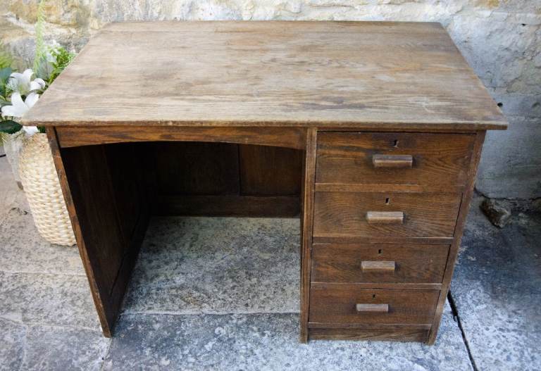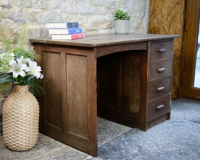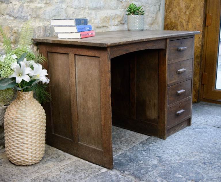A charming old solid oak single pedestal kneehole desk estimated to date from the 1920s - 1940s. The desk features 4 handy drawers. This desk doesn't come apart, so please check the measurements below before ordering to make sure that your access is adequate.