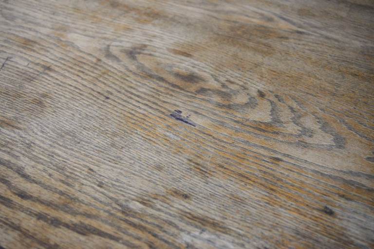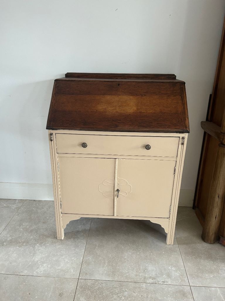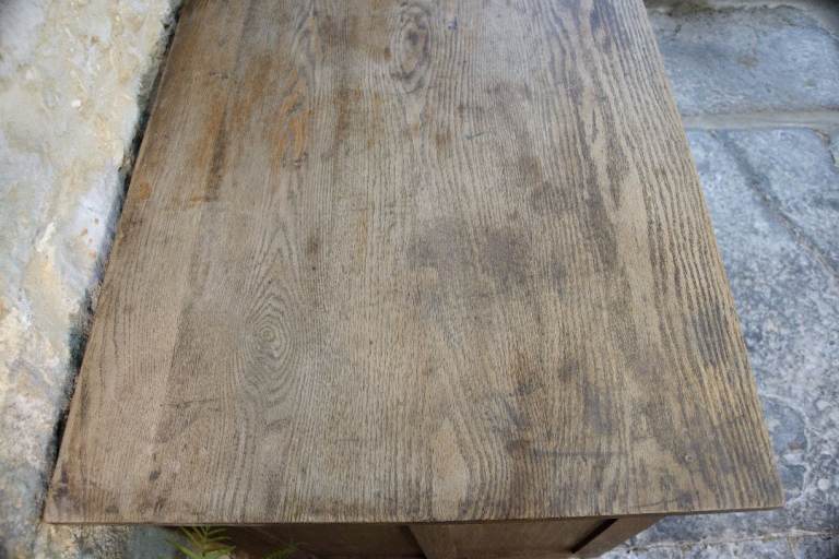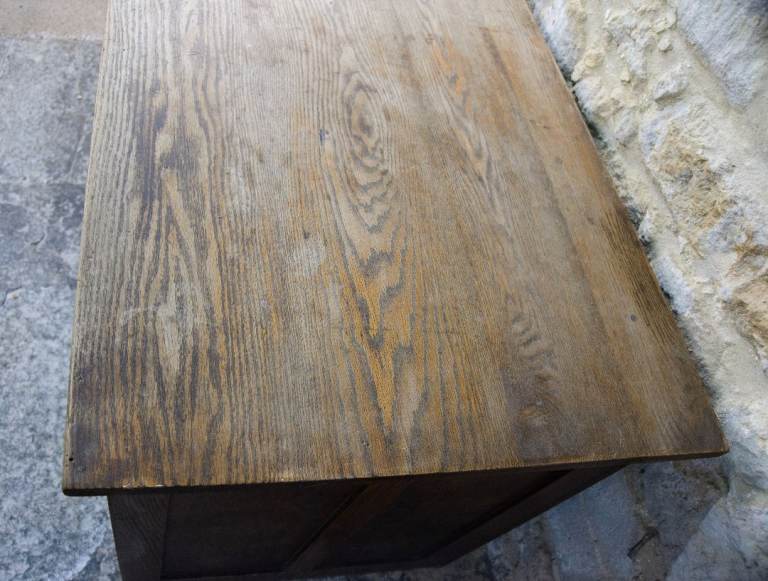 In good antique condition with some scuffs, scratches & marks commensurate with age. The drawers all move freely and drawer bases are in tact, although badly marked from ink. The key's missing, but all drawers are unlocked. Most of the finish has worn off the top over the years giving it a nice aged patina. The desk is strong and structurally sound.