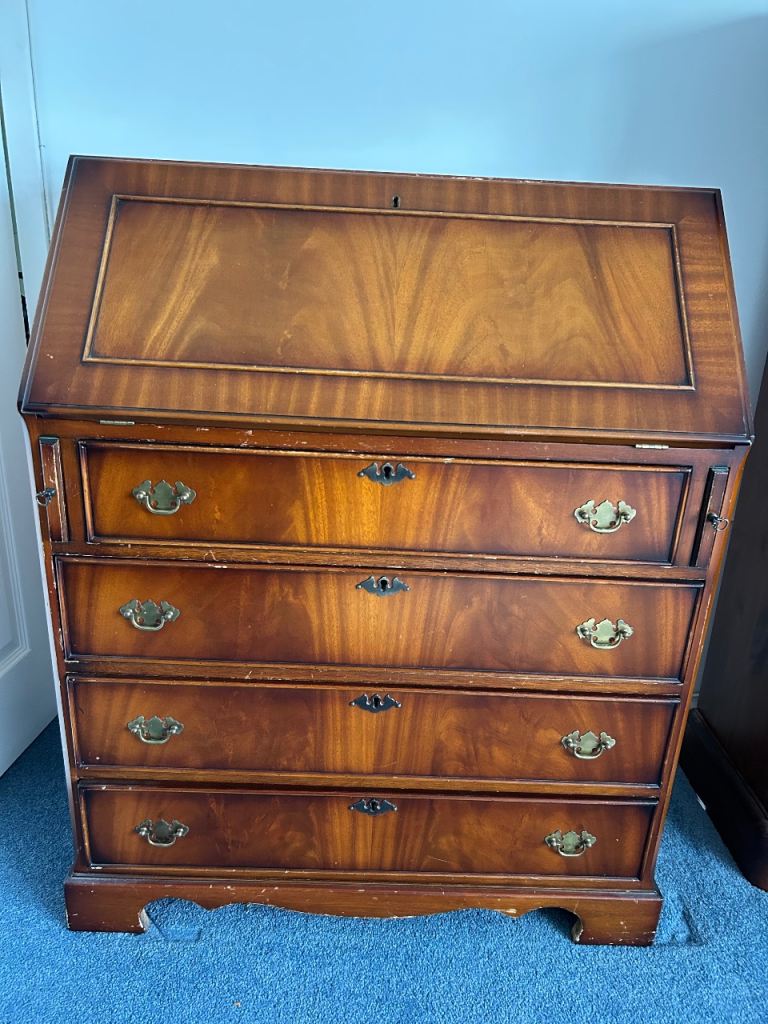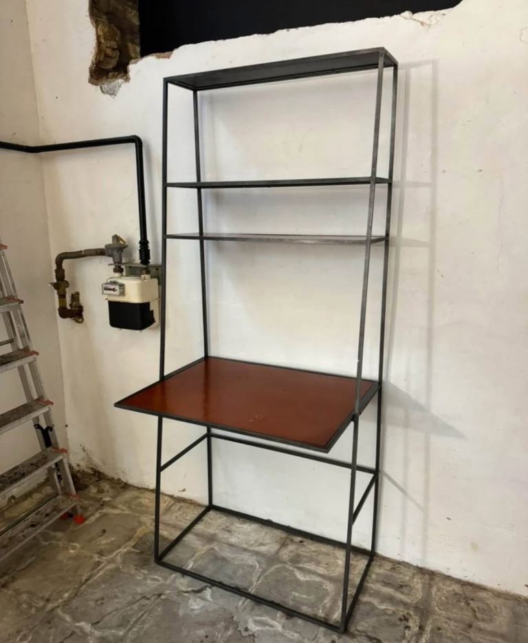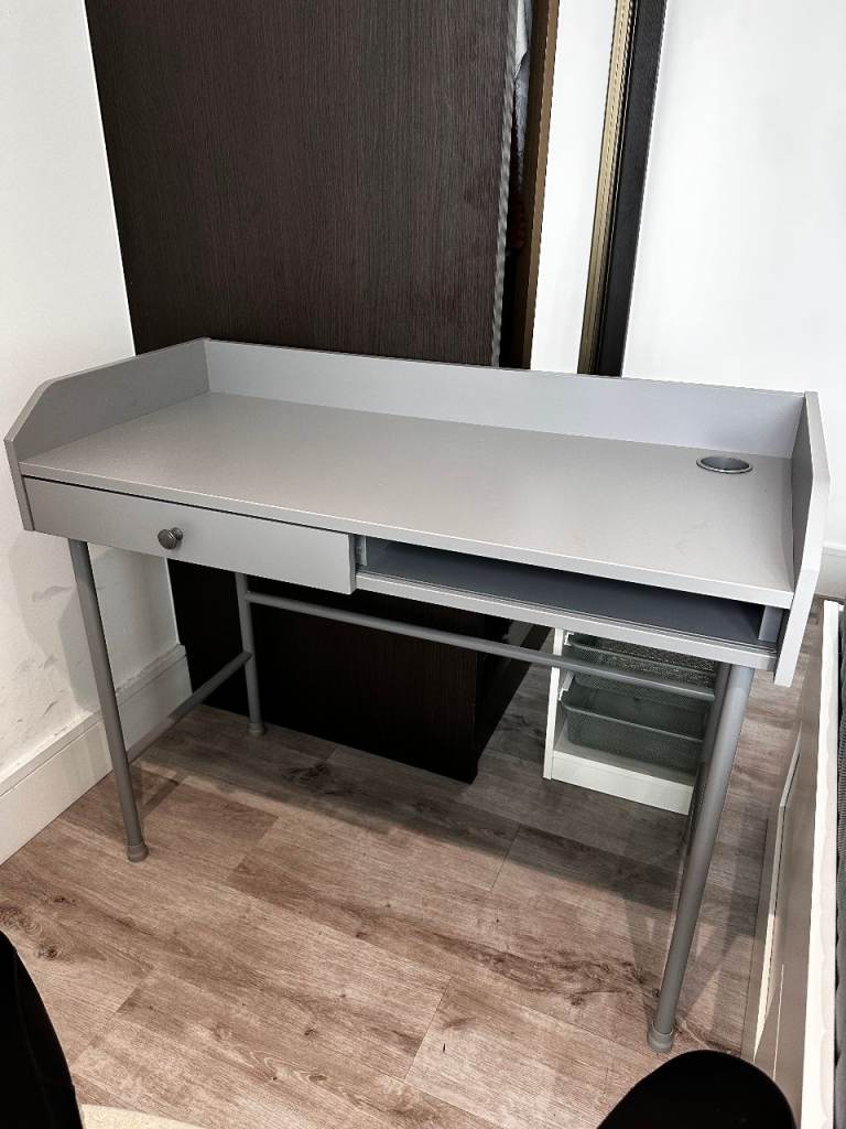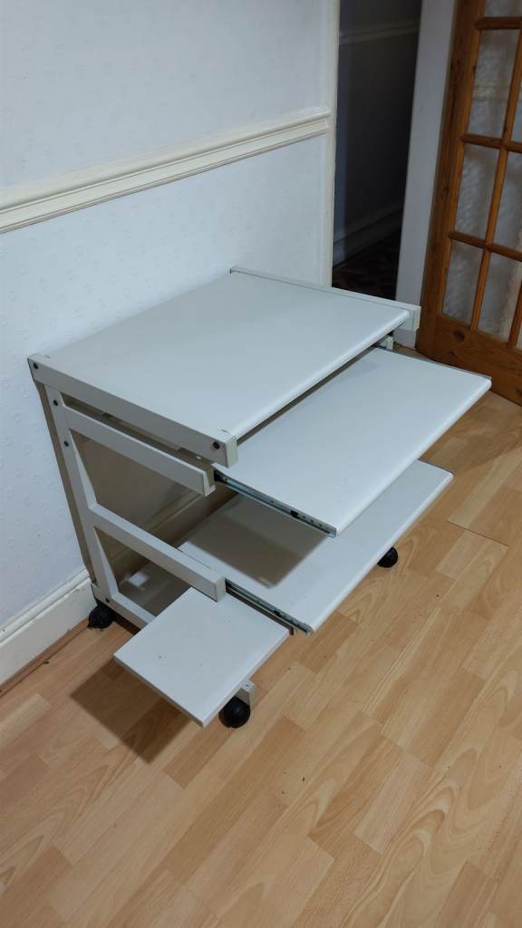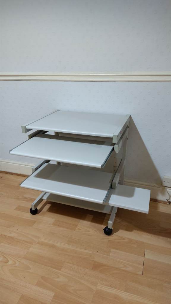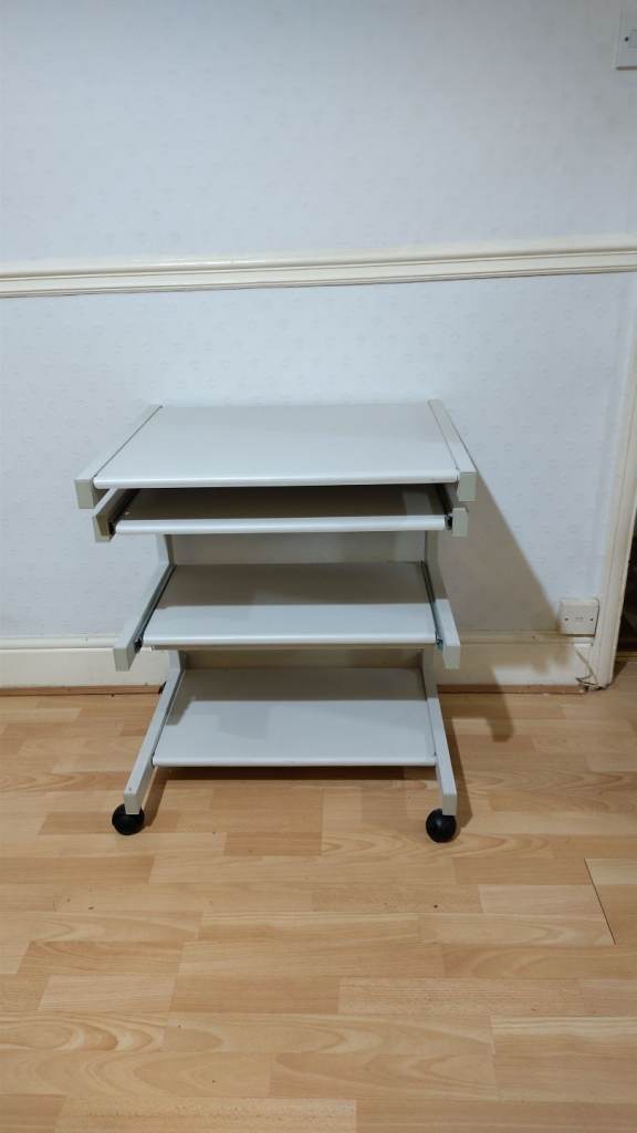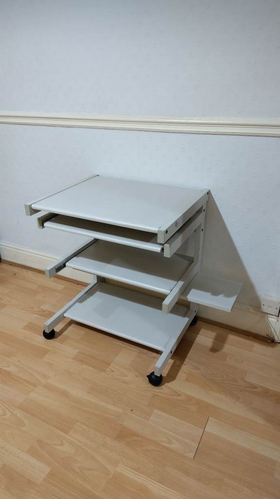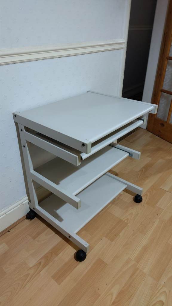 Small desk, on wheels with slide out shelves. Grey metal. Useful for home office, study, arts & crafts, etc.