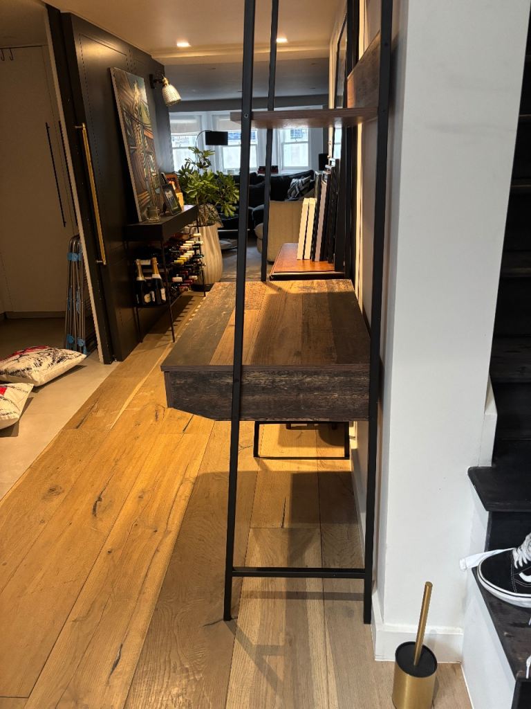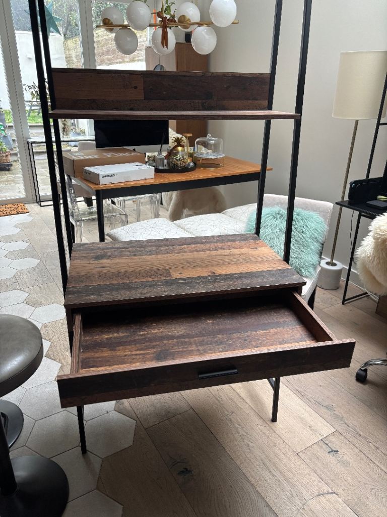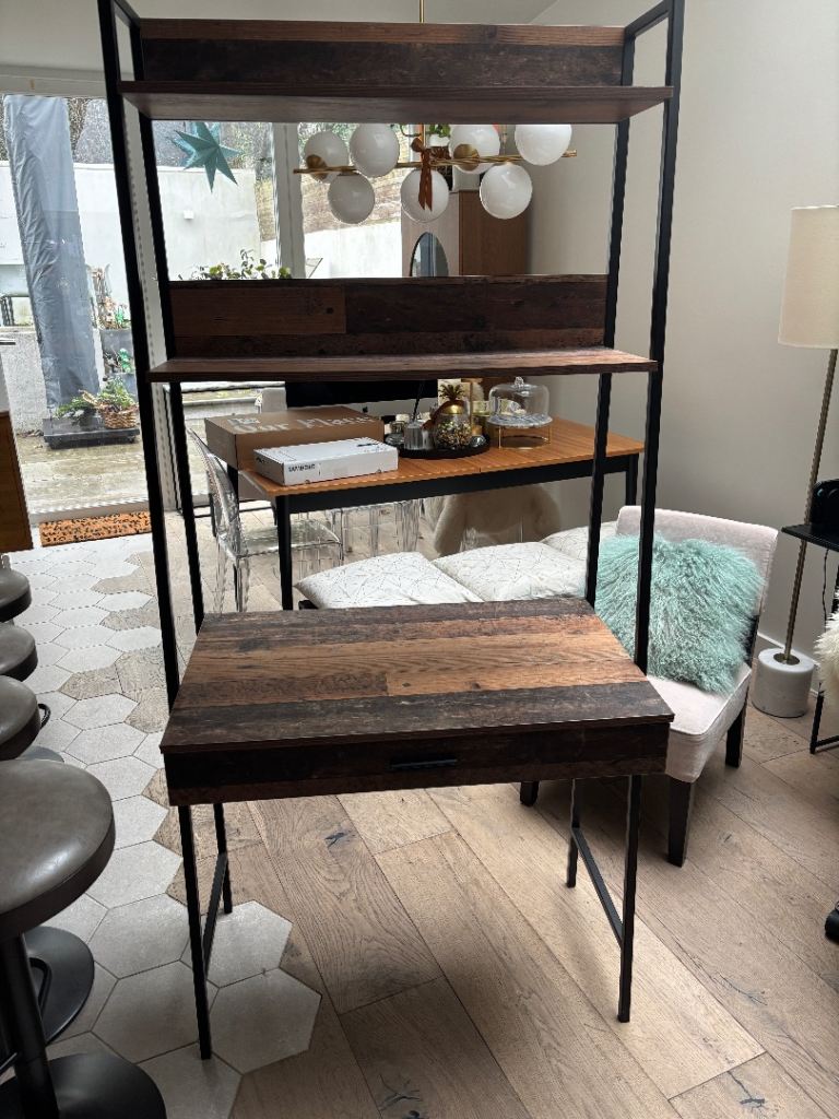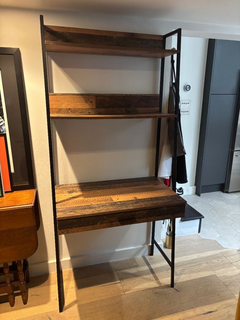Tenley Computer Desk/Writing Desk by Fernleaf/Wayfair. Sits against the wall with one drawer below desk and two shelves above.
