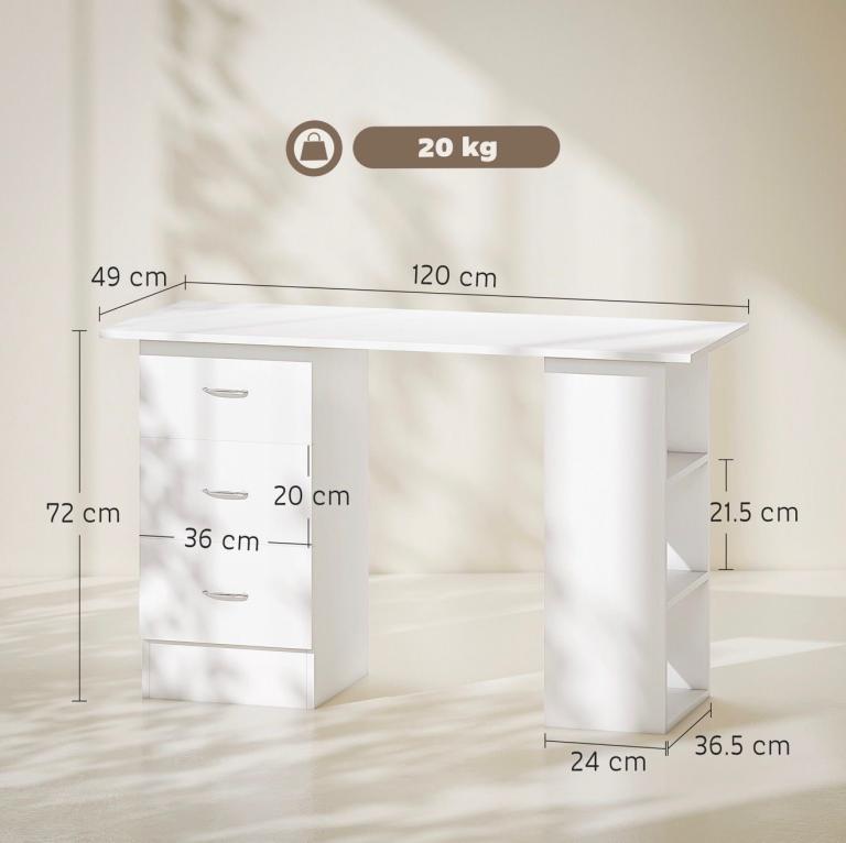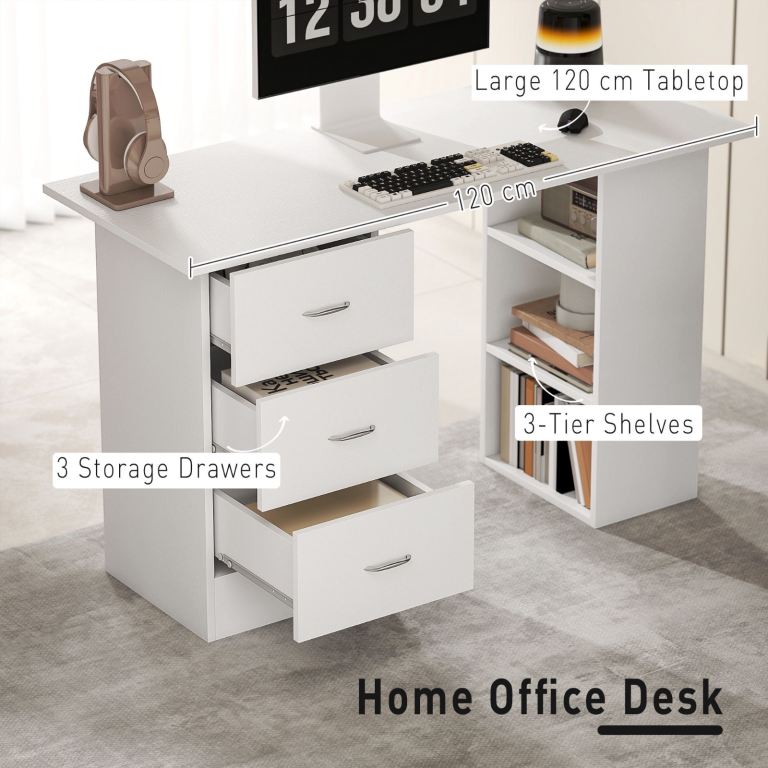 Computer Desk, Home Office Desk, Writing Table, PC Workstation with 3 Storage Shelves and 3 Drawers for Working, Study, 120 x 49 x 72 cm, White