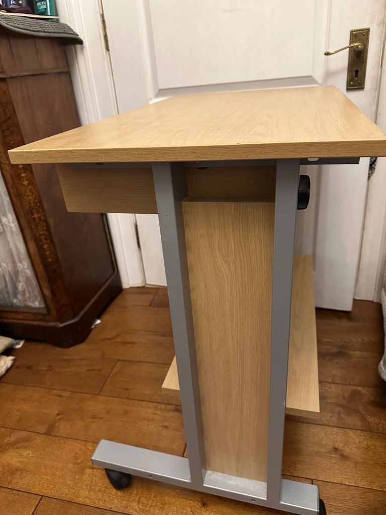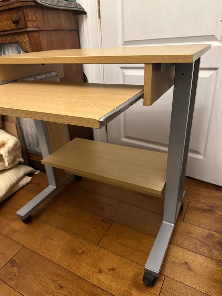 Computer desk with pull out shelf and lower shelf, with solid 4 wheels with brake system, with solid metal structure.
