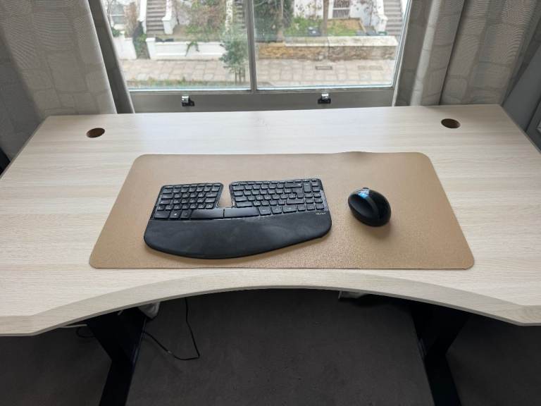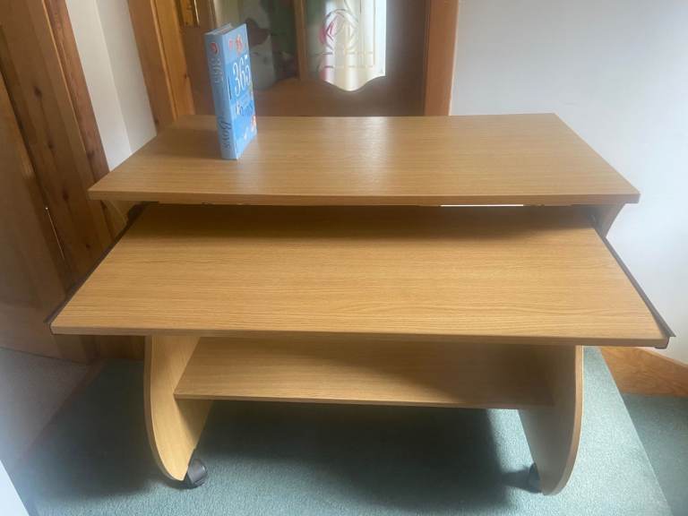 PC or office desk with slide-out keyboard/work shelf. A compact unit with additional lower storage shelf. Four rotating roller castors (2 x front lockable), making it flexible to reposition if/when required. Finished in a warm, beech effect wood with rear mounted cable guides.