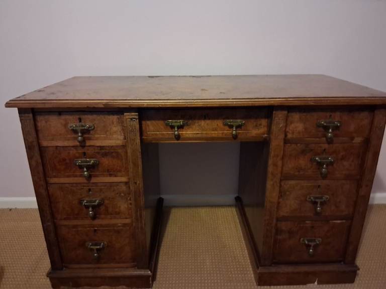 Solid wood desk. 8 side drawers all in in good condition. 1 middle drawer with some damage to back. Surface veneer has some water damage.