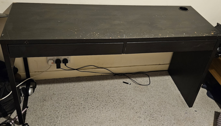 Desk has visible marks and stains from pens.