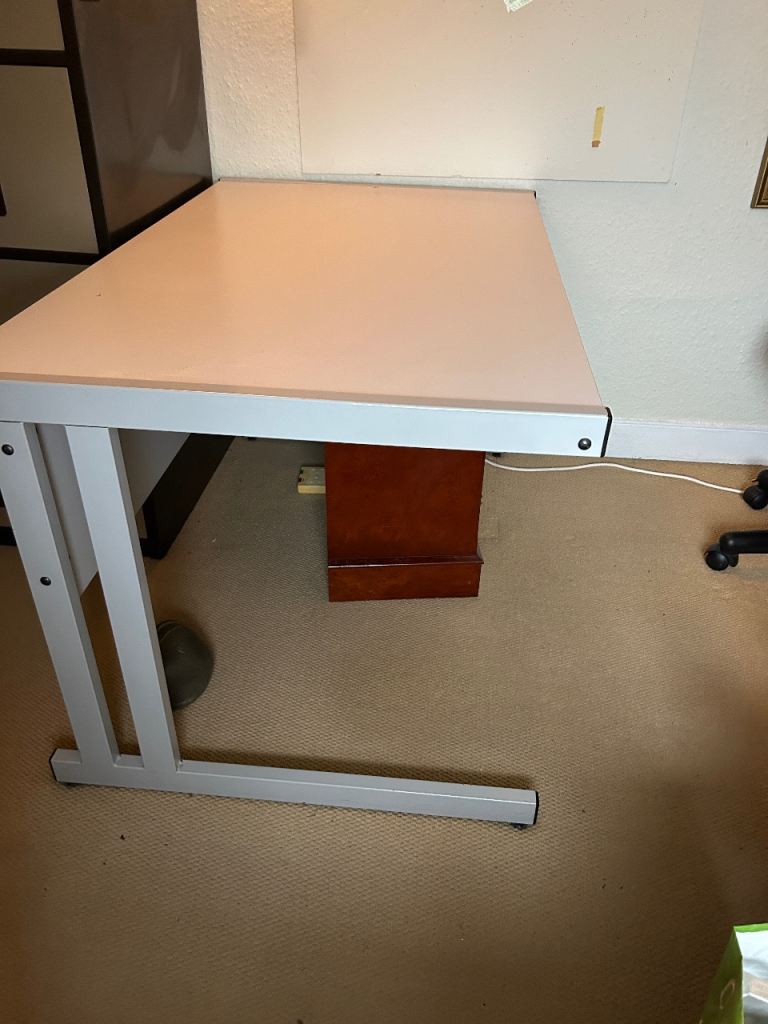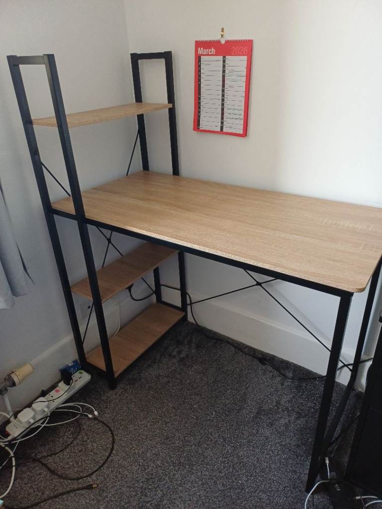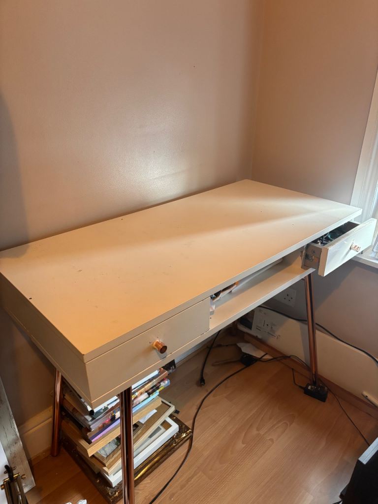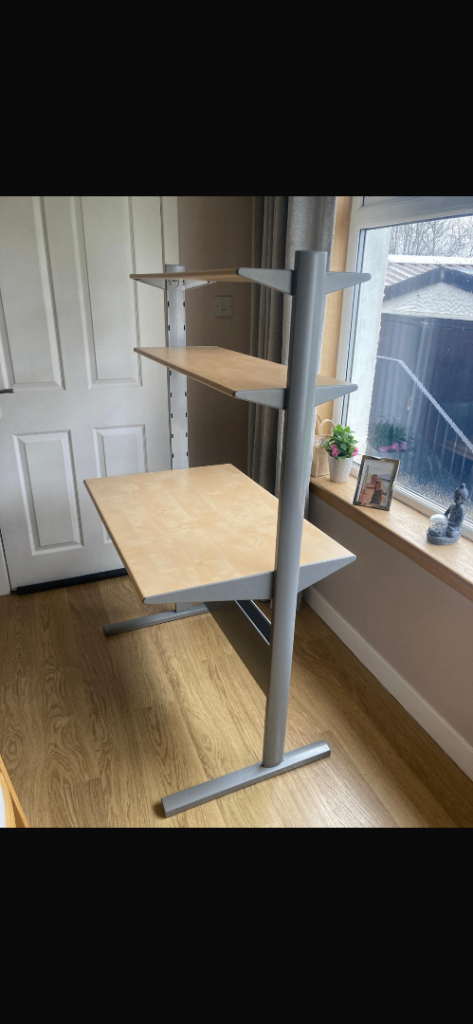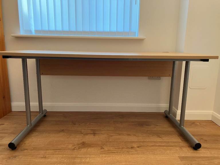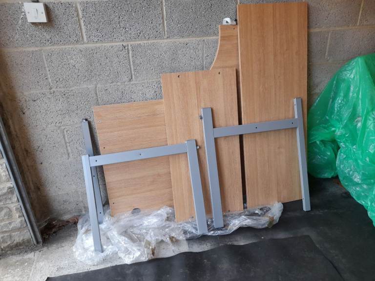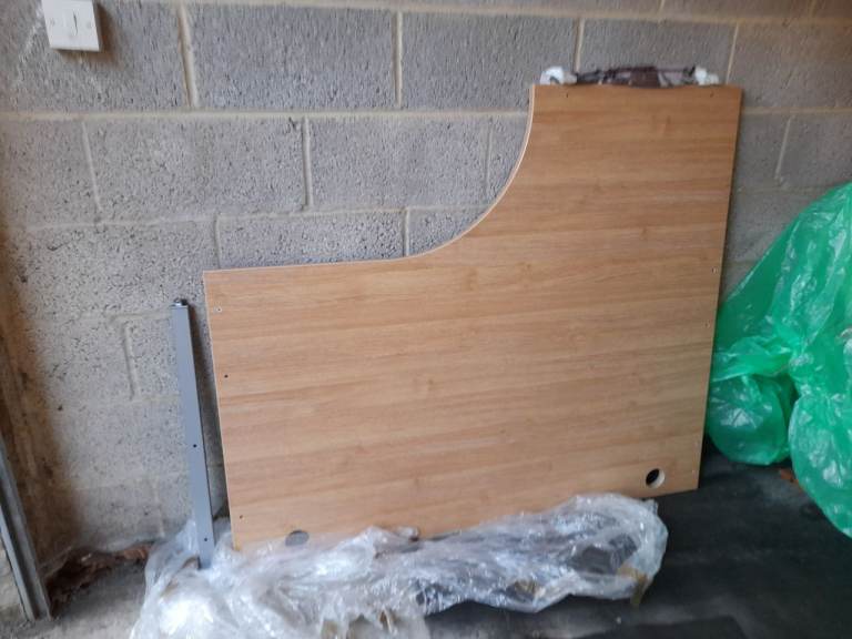 This is a desk/table suitable for use at home or in an office. Ideal for computer work. Size is 1200mm x 1400mm (4ft x 4ft 8in). Maker is DAMS. Has been dismantled back to flat pack form (see photos) and will go into a Volvo estate for example. Includes all fixings and instructions for erection. Was priced at £140 new.