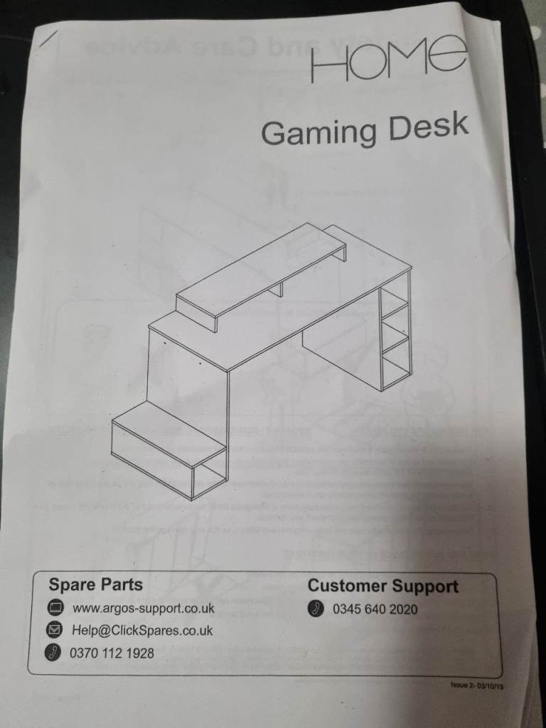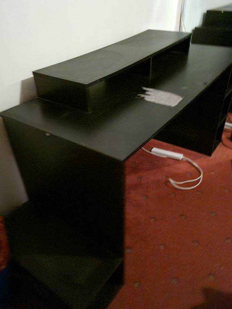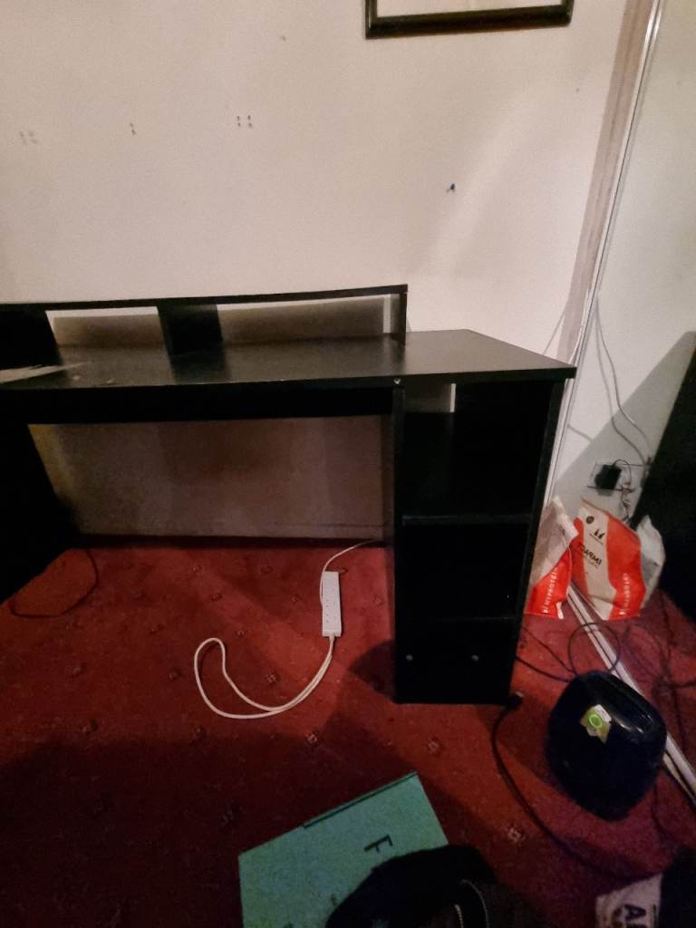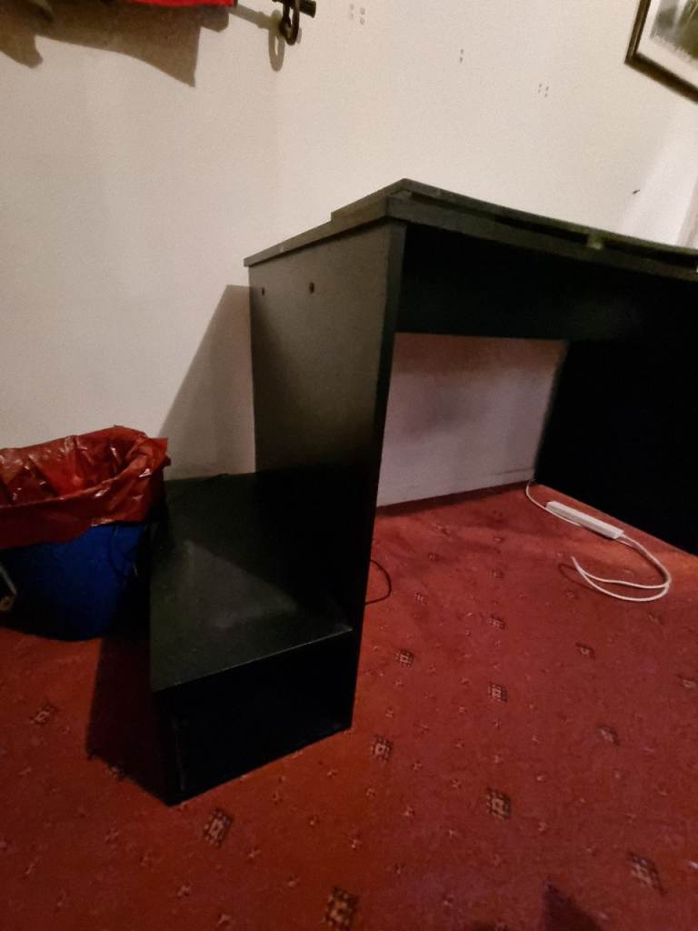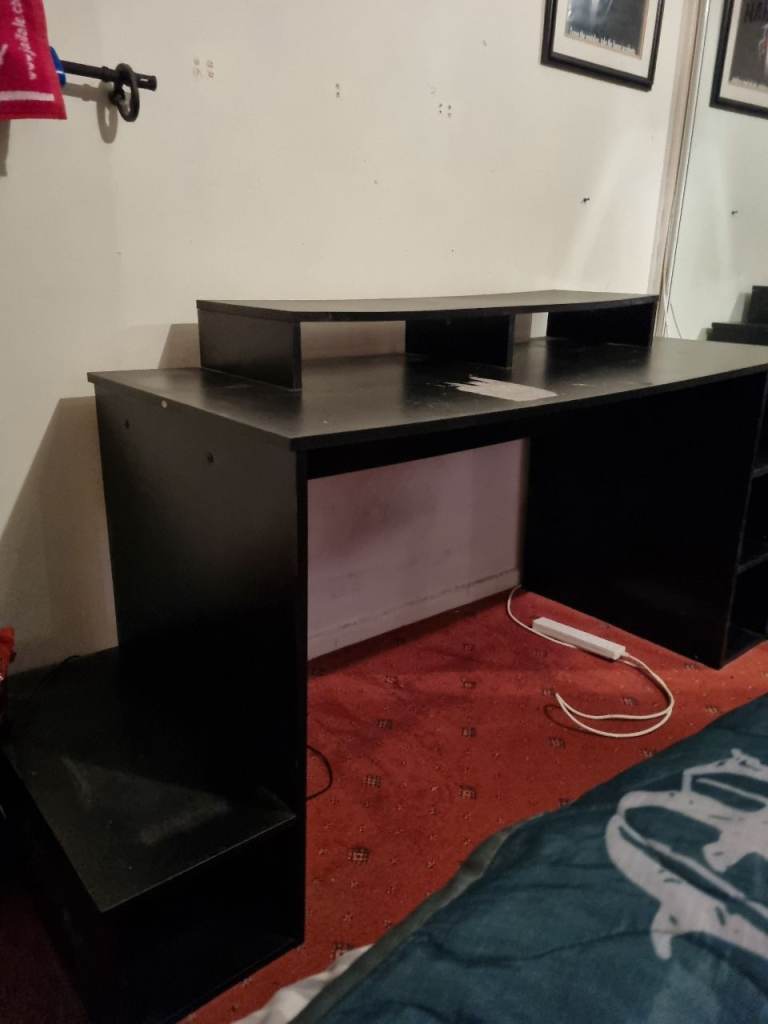 Large computer / office desk. Black in colour. This is long and has various compartments. It has been dismantled so easy to transport and also has the original assemby instructions as well. Dimensions are 1640mm long X 588mm wide X 830mm (at highest point) £10