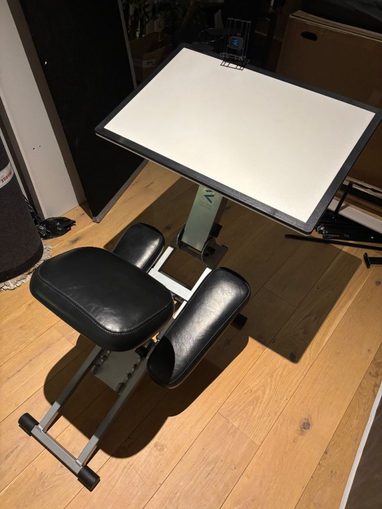 Edge desk system, all in one kneeling seat and desk.