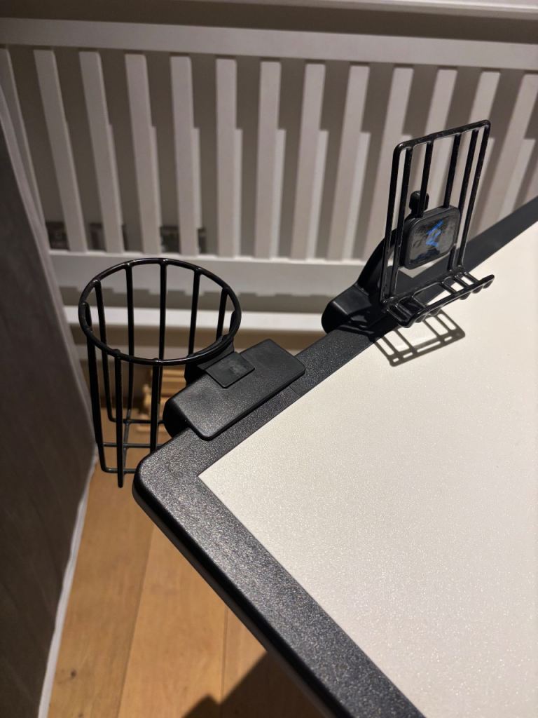 Has phone holder and cup holder attached.