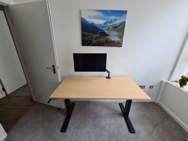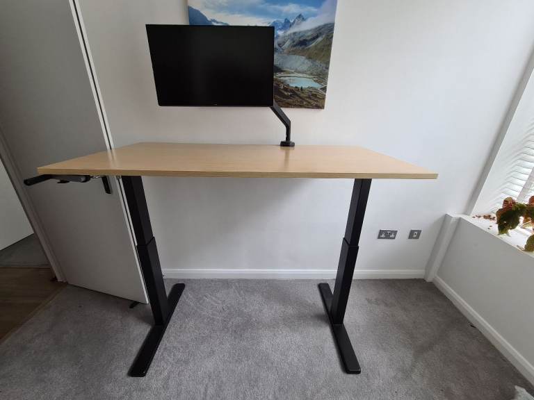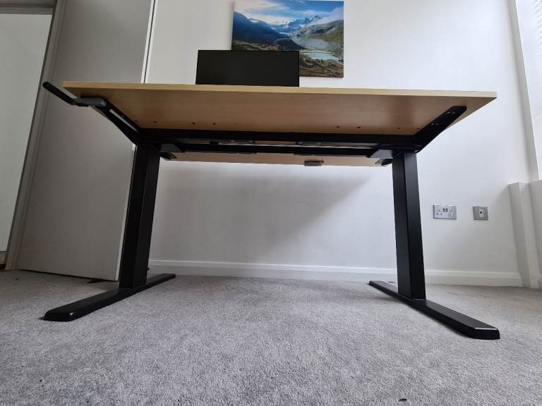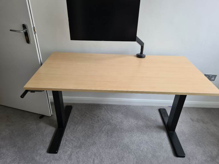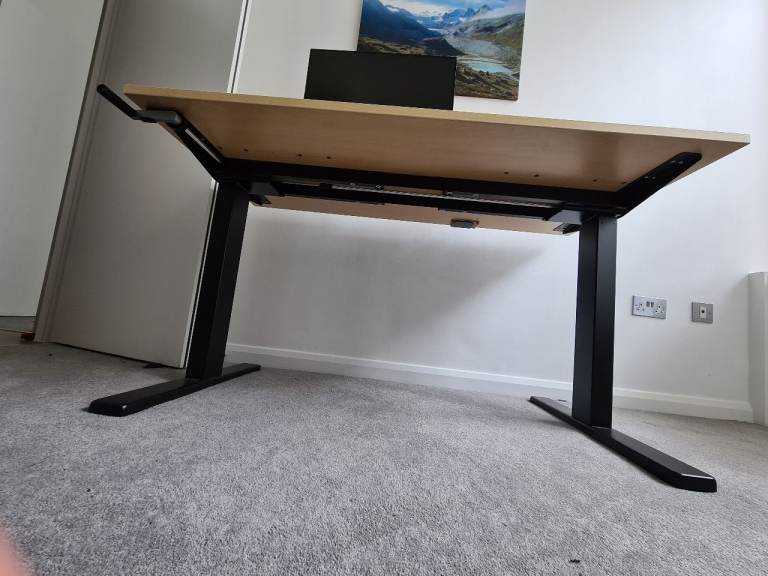 A height-adjustable desk. Flexispot manually adjustable legs (you can see the crank handle) and a pale engineered wood-style top. The top is 140cmx70cm. Easy enough to assemble and disassemble for transport, all screws etc provided. Very solid, I think it's rated for 70kg.