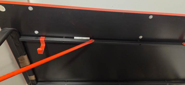 Strong and sturdy desk with a sleek black tabletop and red frame, perfect for gaming setups, home office, or studying.