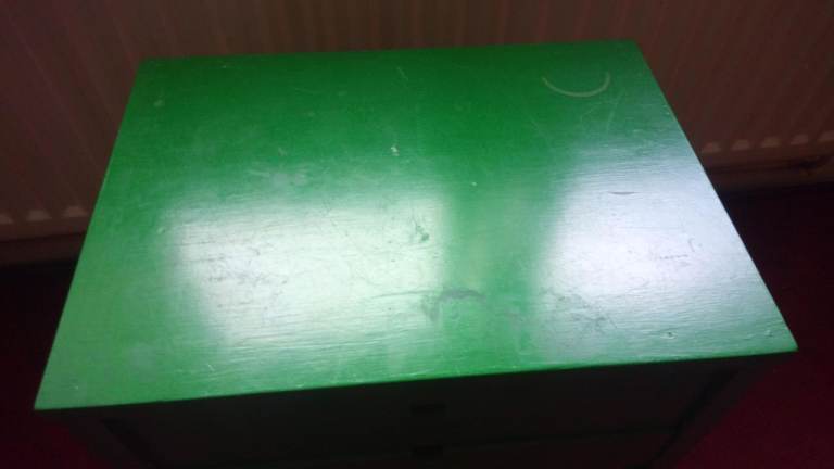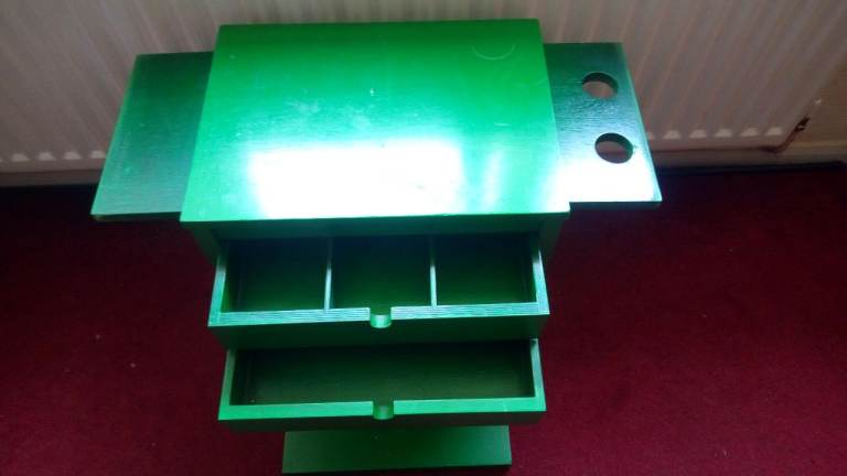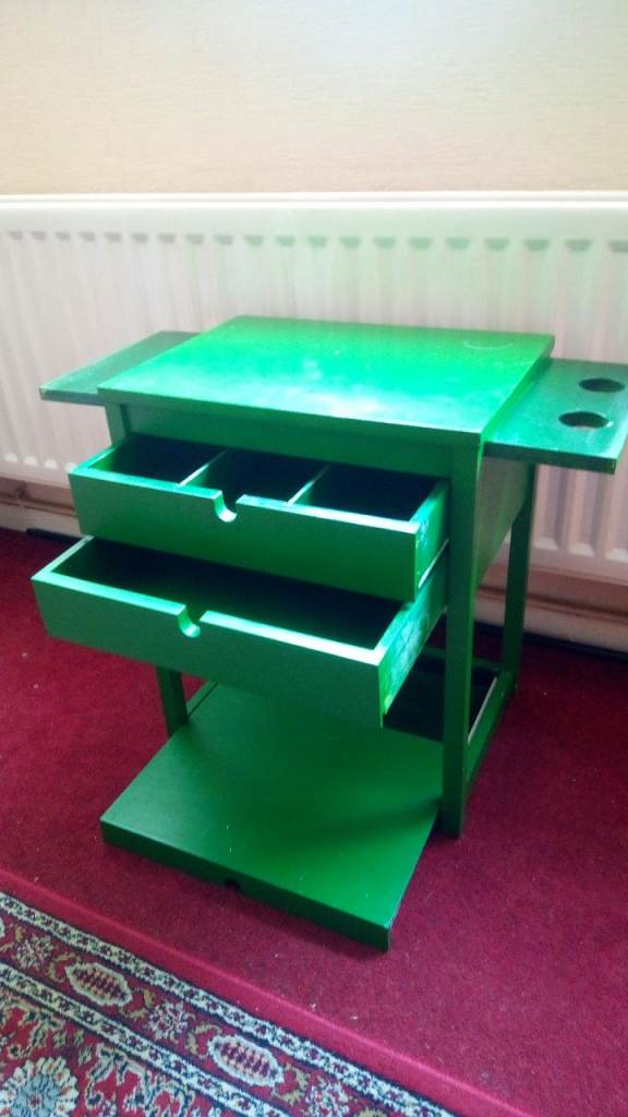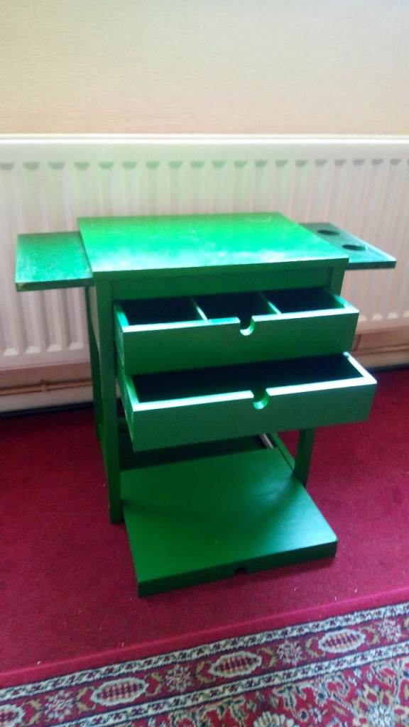 Green Stationary table. multiple drawers and shelves. good for storing stationary items i.e paper, pencils etc. still in very good condition