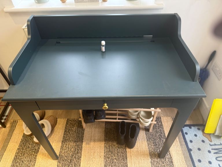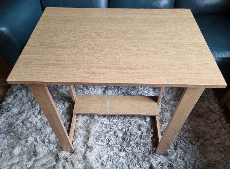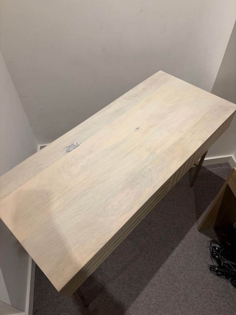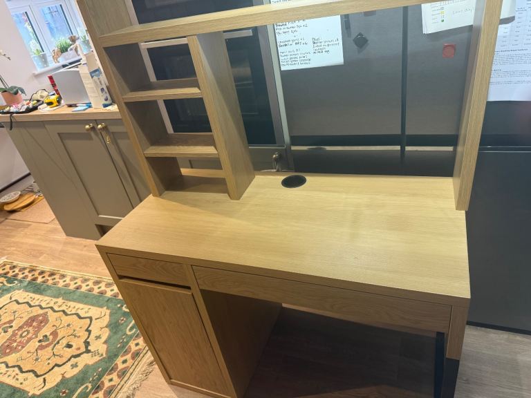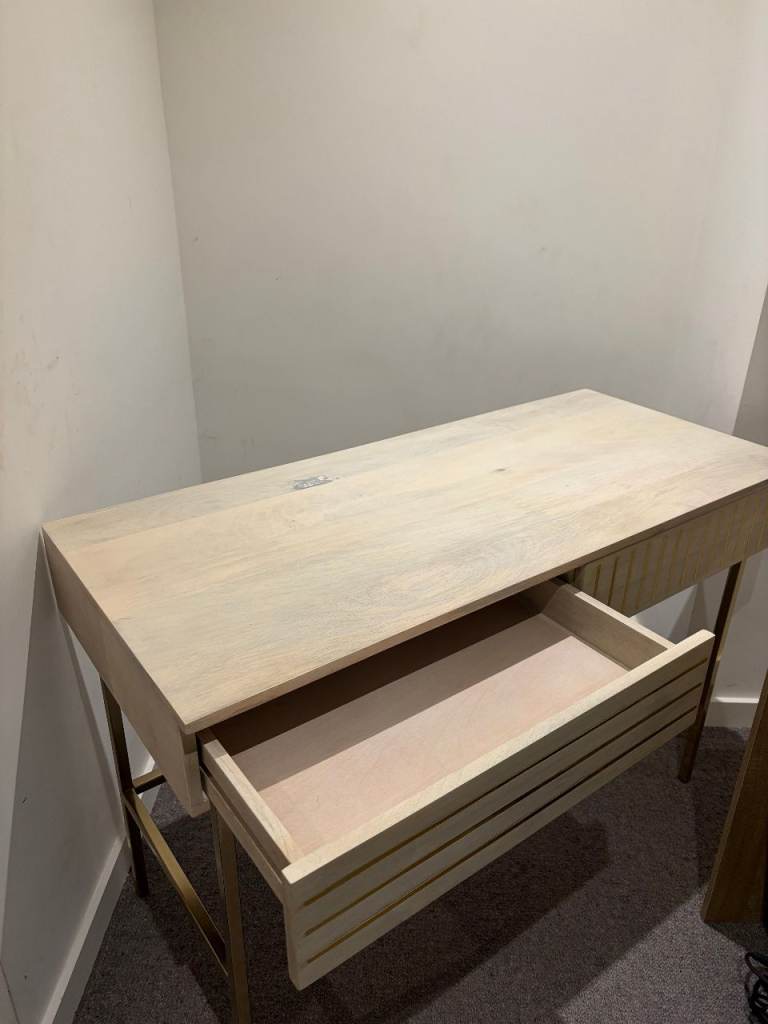 The Habitat Samara 2 Drawer Office Desk in Light Wood is a stylish and functional computer desk made from solid wood and steel. It features a spacious design with two drawers for convenient storage. The desk stands at 76 cm tall, 115 cm long, and 50 cm wide, providing ample space for a comfortable work environment. The light wood tone adds a touch of elegance, while the beige colour adds a modern and fresh look to any home office. Perfect for those looking for a sturdy and stylish desk to enhance their workspace. The desk is brand new; I received it a week ago and assembled it a few days ago. I am reselling it because unfortunately it does not fit in the space initially planned to put it.