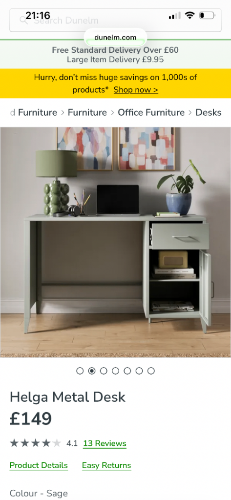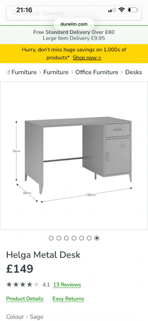Stunning helga metal desk in a beautiful sage colour . Desk has drawer and storage cupboard. Selling in Duneim right now for £149