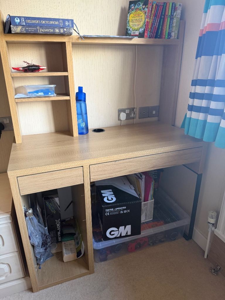 Study table in used but good condition for sale. Collection please. Not dismantled yet so you can view it but easy to so if required. I have two but am keeping one as the other is no longer required. Good space, shelves, drawers x2 and organisation of books etc.