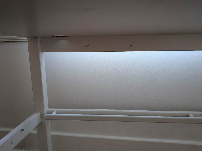 Under desk there are screws from where an extension cable was attached, and a bar my daughter hung tongs/hairdryer etc.
