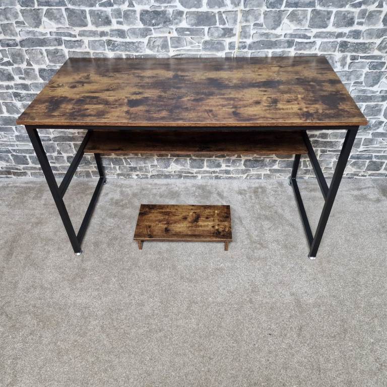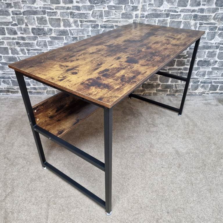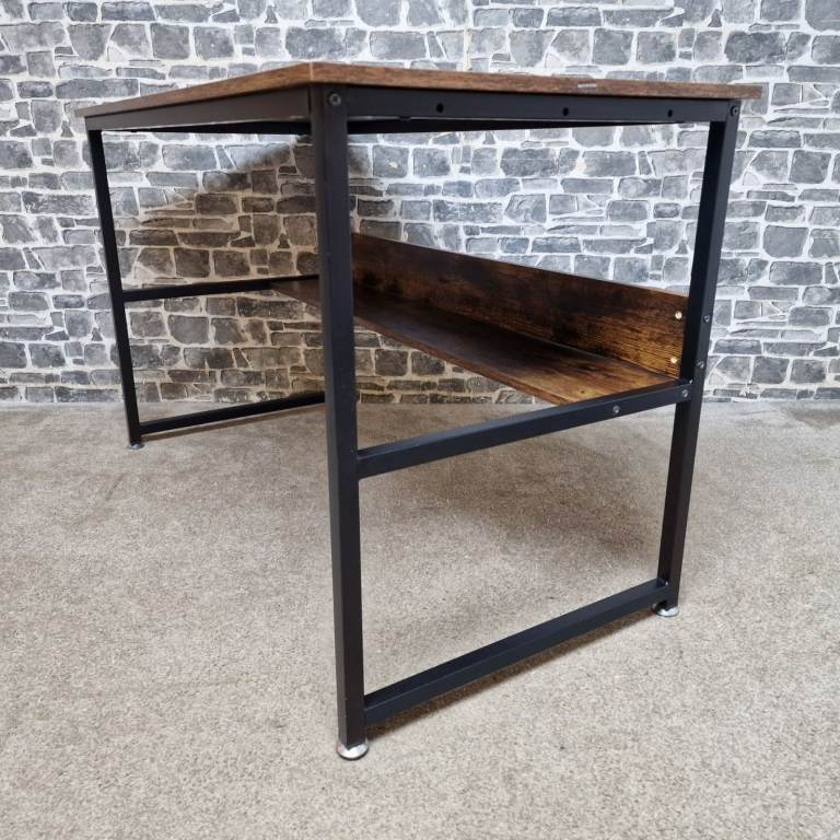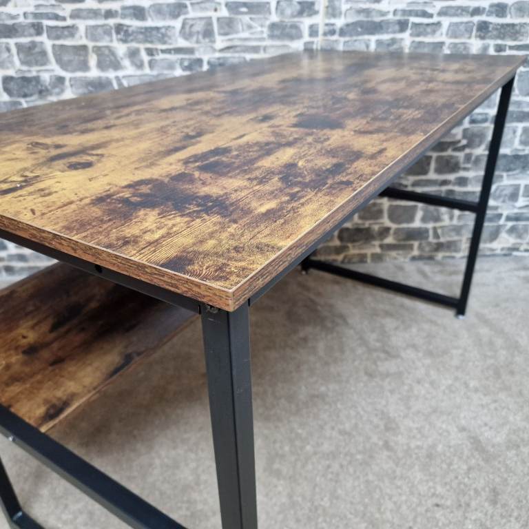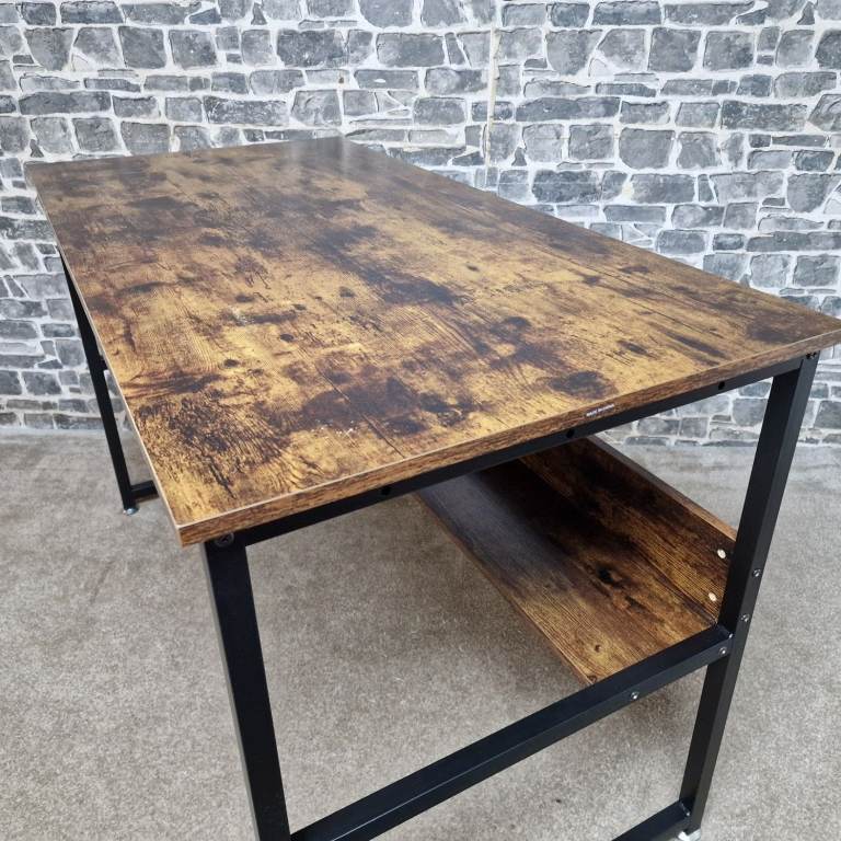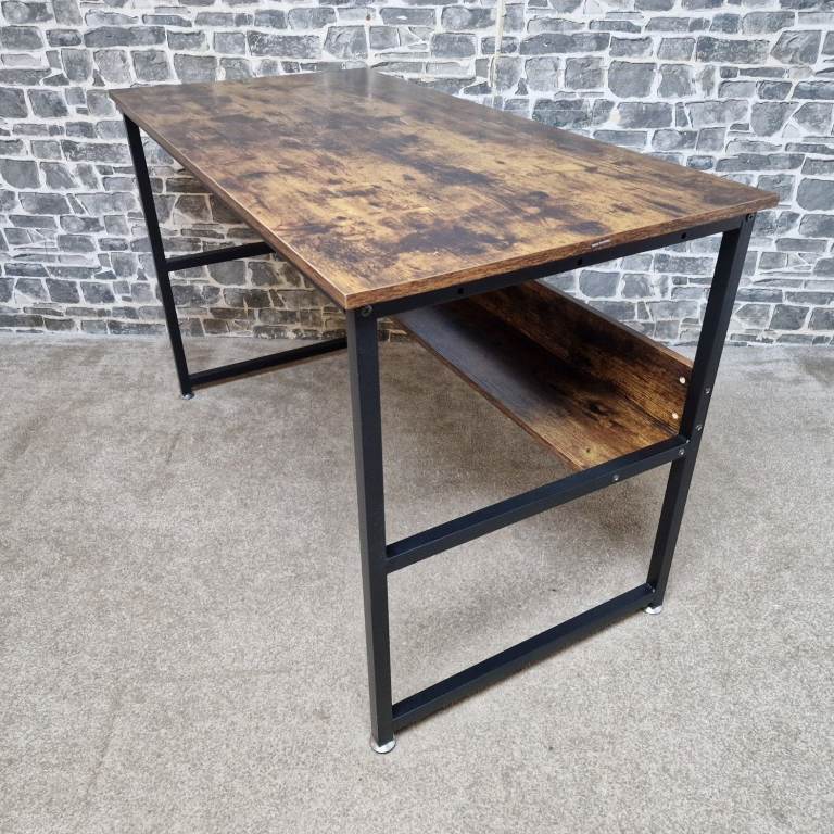 Sturdy industrial-style computer desk featuring a rustic brown wood-effect top paired with a black metal frame. The desk has a clean, modern look with a practical lower storage shelf, ideal for books, office equipment, or a PC tower. It’s solid and stable, making it suitable for home office use, study areas, or even as a writing or workstation desk. The desk is in good condition, with only minor signs of use consistent with normal handling, and presents well overall. Dimensions: L 120 x D 60 x H 76 cm