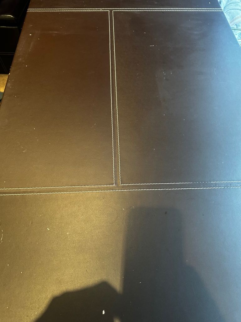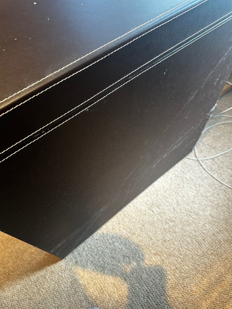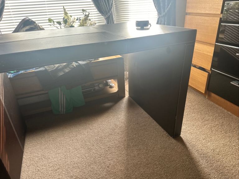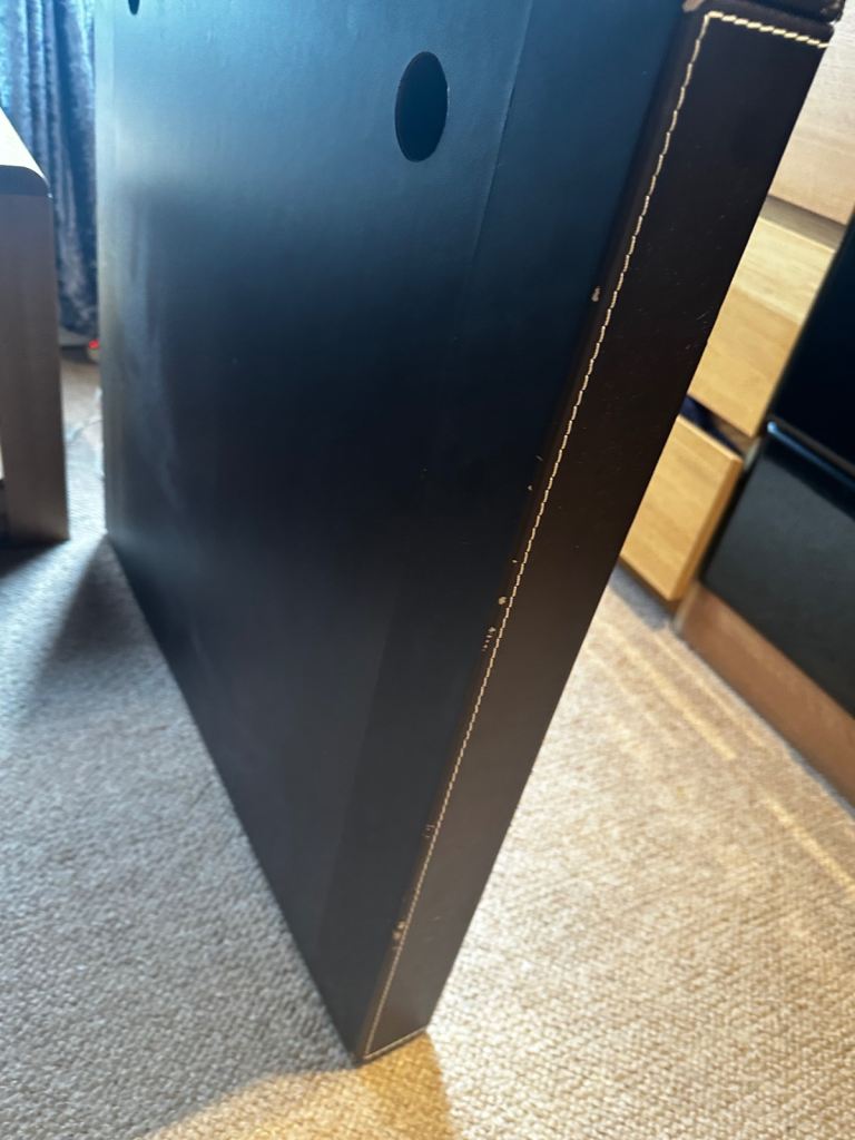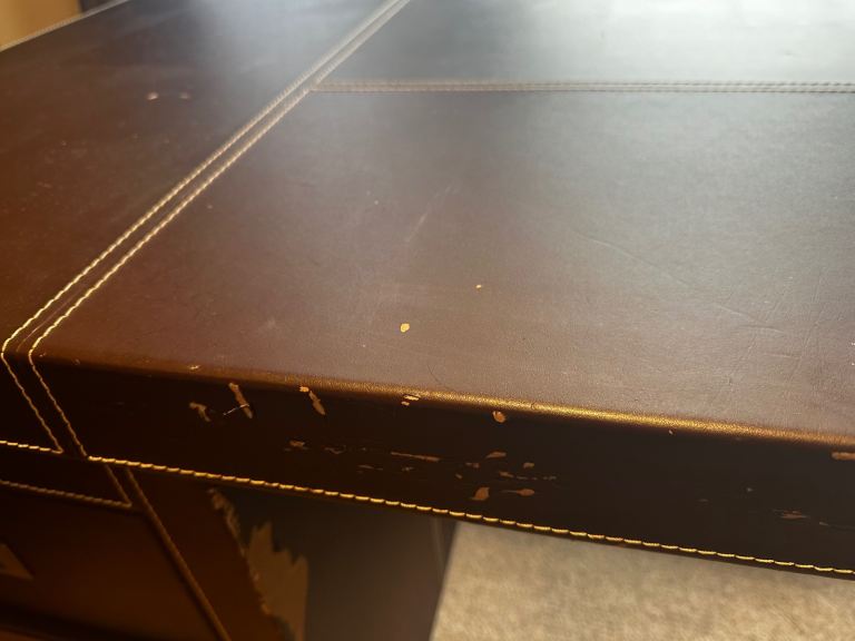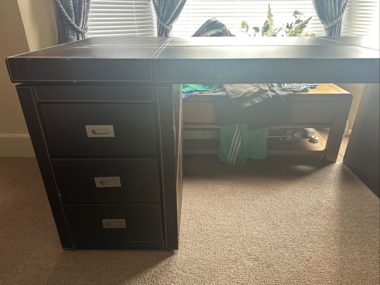 Bought this from Made over 12 years ago. It was well north of £300 as I recall. It’s given solid service in our spare room ever since. Very sturdy and well made. Comes in three pieces- the desktop, wrapped in brown faux leather with visible stitching as pictured. Its heavyweight. Around 15kg. Then there is a side panel and the three drawers section, which forms the other end of the desk. The drawers are deep and have the same stitched pattern as the table top. Sadly, pieces of the faux leather have been picked at/pulled away- I suspect by my daughter, though no admissions ever made. Looks a little unsightly but in no way affects use of the desk. If you were talented/creative or motivated, this would be a great project to retrim the top and or damaged areas. Otherwise, you are buying a solid sturdy desk including a robust set of three drawers. Collection only due to size and weight.