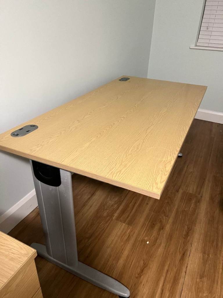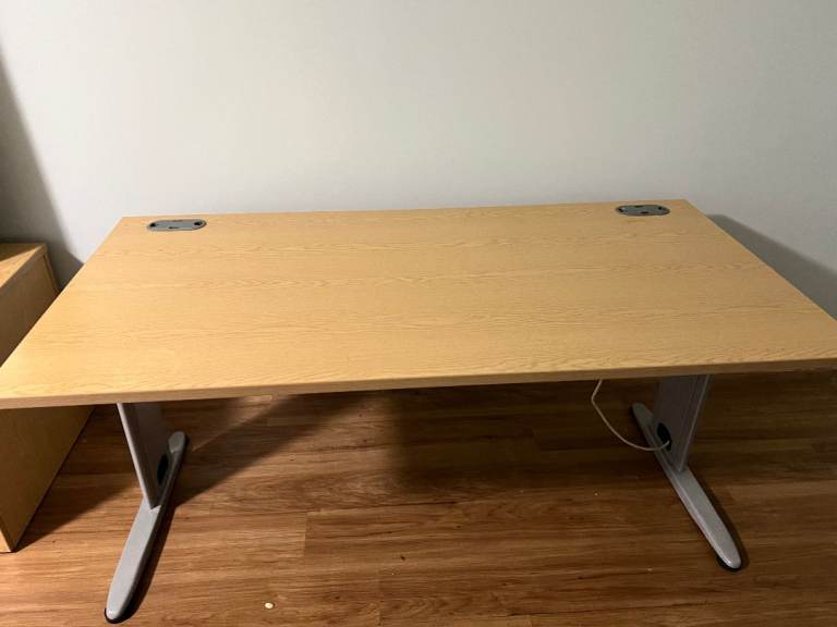 Spacious office desk with light wood finish and sturdy metal legs. Features built-in cable ports for neat cable management. In excellent condition.