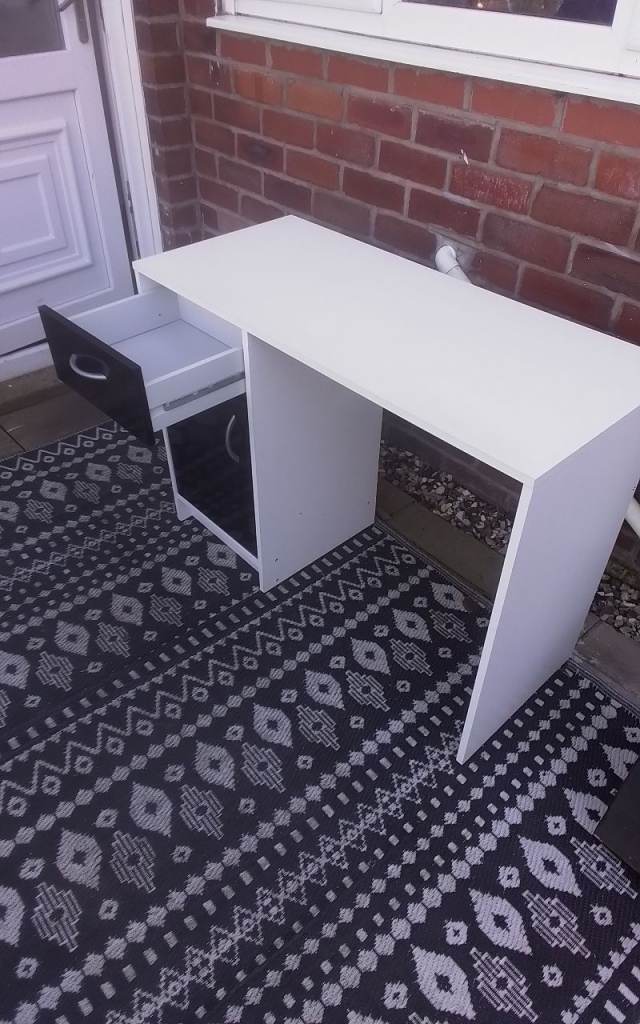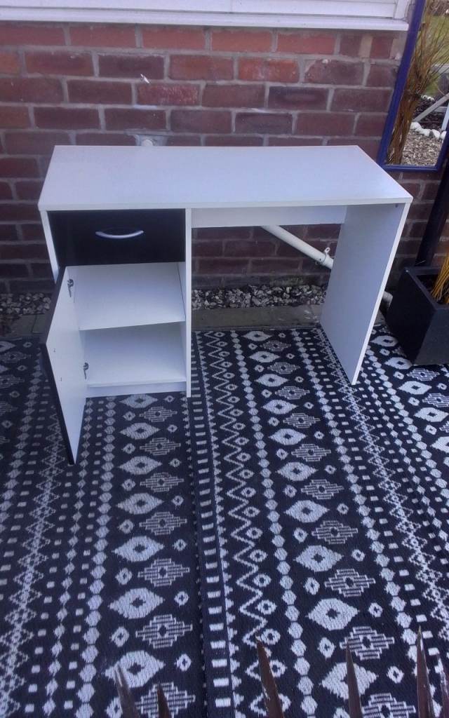 A very stylish good quality modern desk in very good clean condition, having plenty leg room, a spacious cupboard with inside shelf and silver chrome handle, a matching top drawer, and measuring 74cm tall x 100cm wide x 45cm deep,a really smart good looking item, can deliver for cost of fuel only if required thanks.