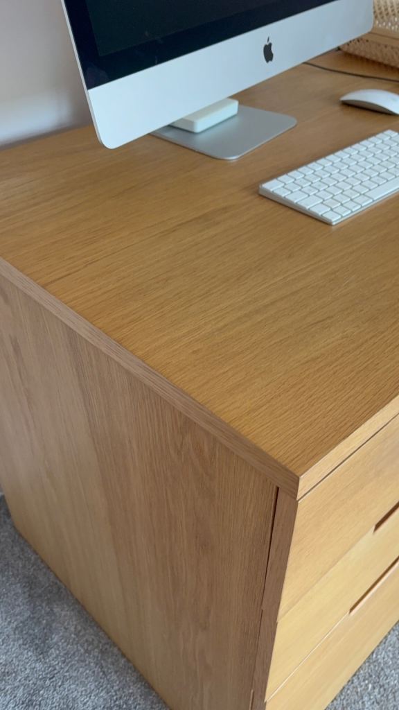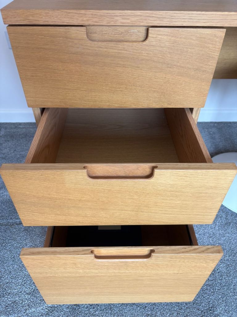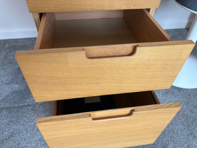 From John Lewis, solid desk in very good condition. 3 drawers, one suitable for hanging files. Measures 120 cm (l) x 74 cms (h) x 65 ( d). Collection from Woodbury. ( buyer to dismantle)