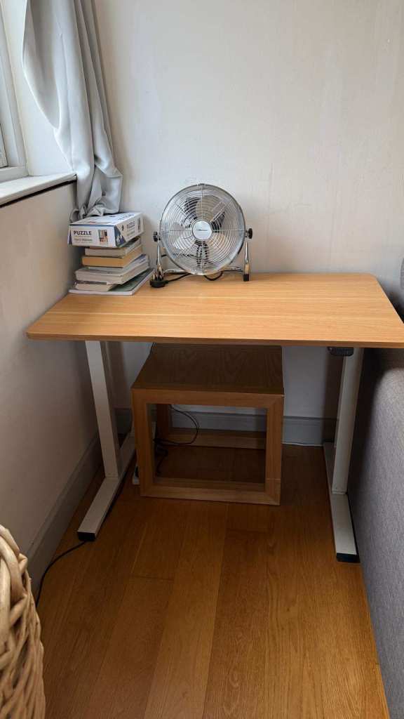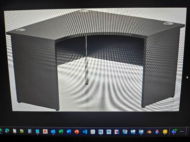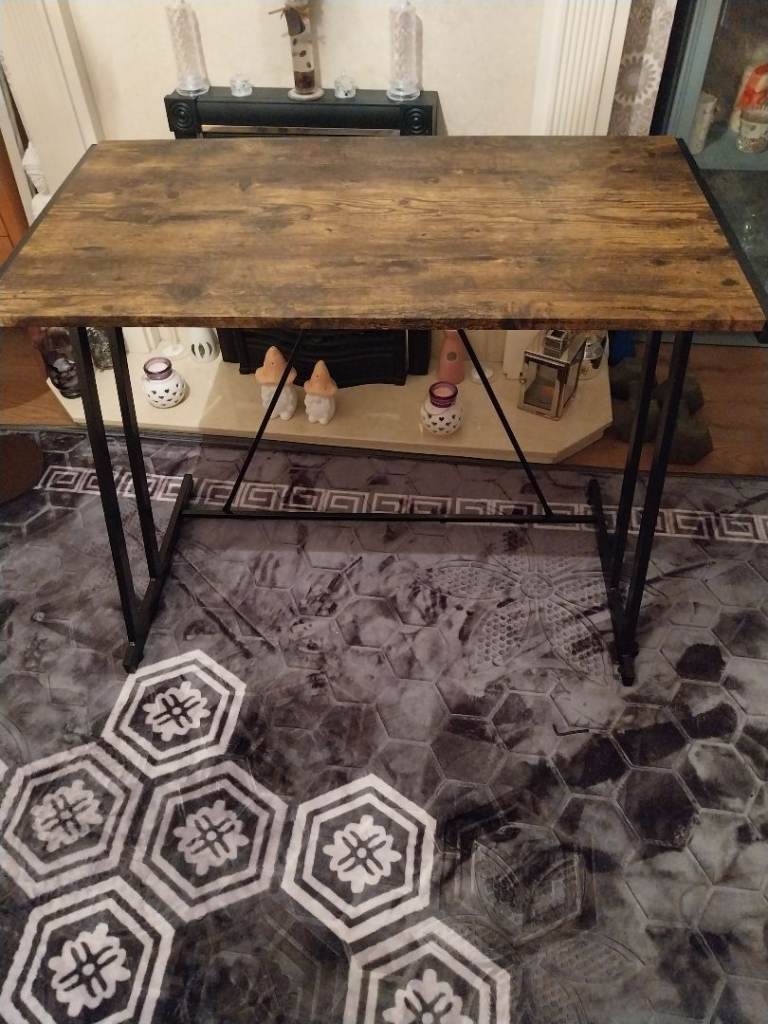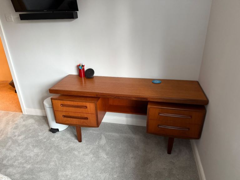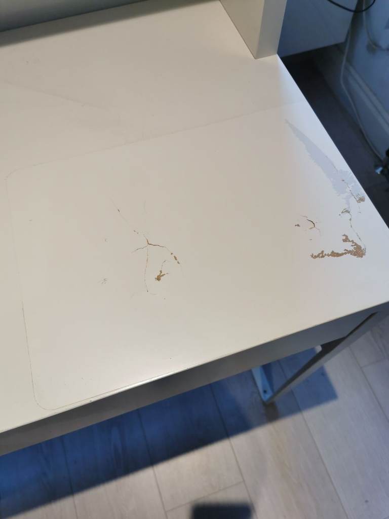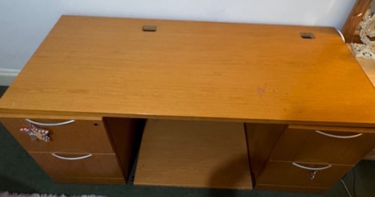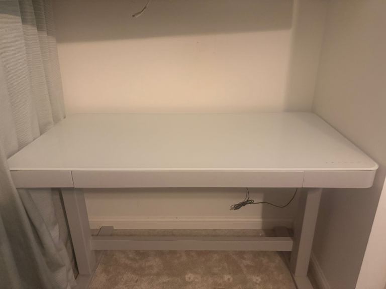 White office/gaming desk with shelving and 2 drawers. Slight damage on side, see pic, would be covered up by mouse mat. 1050mm long by 500mm deep and 1400mm high.