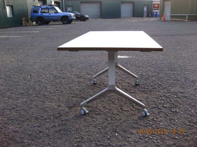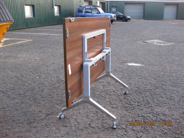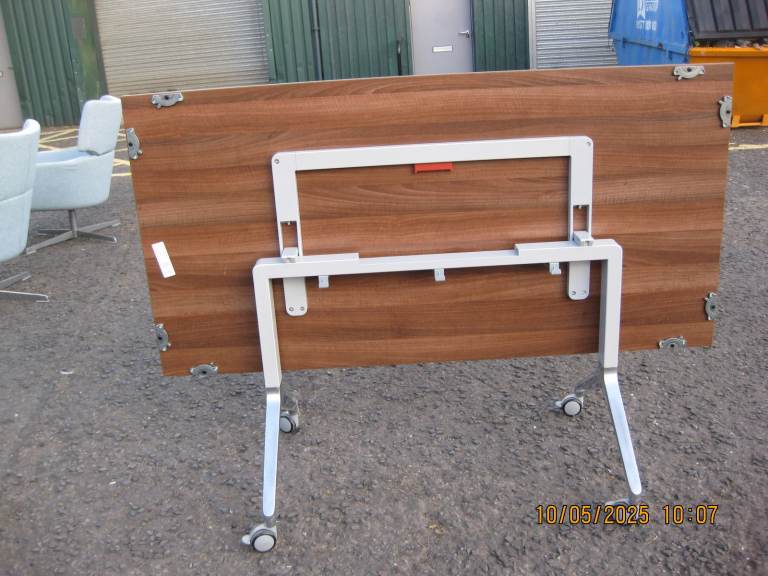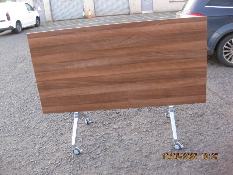 Office Flip-over/flip top tables. Walnut tops, polished alloy bases with locking castors. Made by Boss Design model 'Deploy'. All tables have multipoint table to table linking ability.Top size 160cmx80cm Height 72cm standard Used but in very good condition. Retail price £982.50 inc VAT therefor TOTAL BARGAIN @ £95.00 each. I had 9 of these but only 1 left for sale. Can deliver locally at an extra cost.