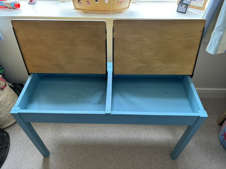 Lovely restored double school desk in varnieeshed wooden desk lids with blue legs and top.