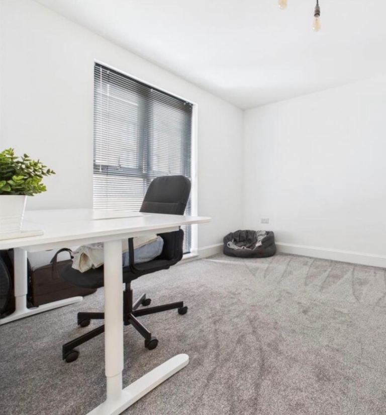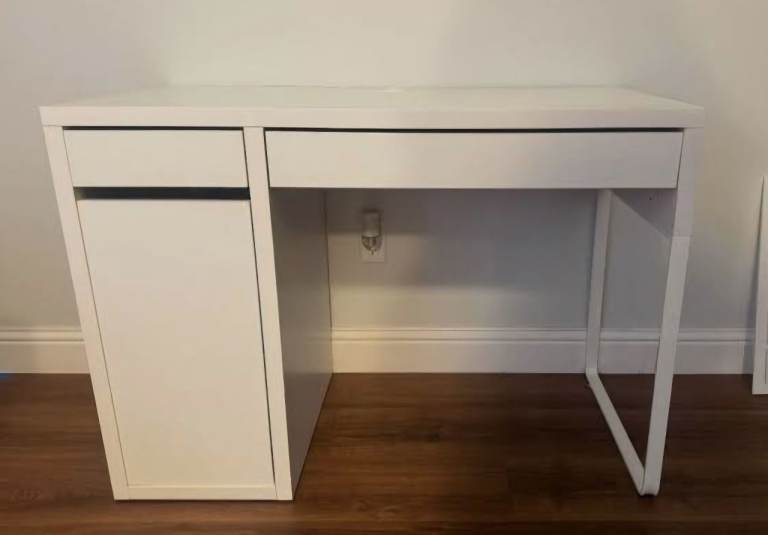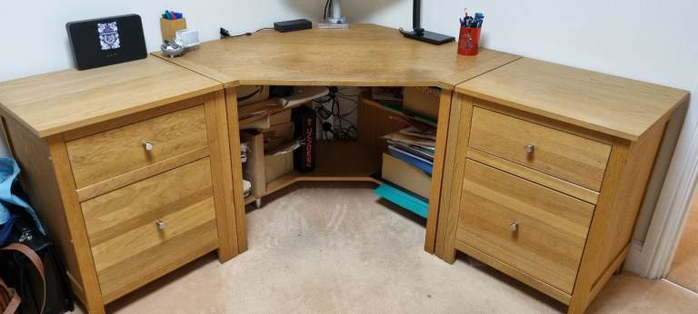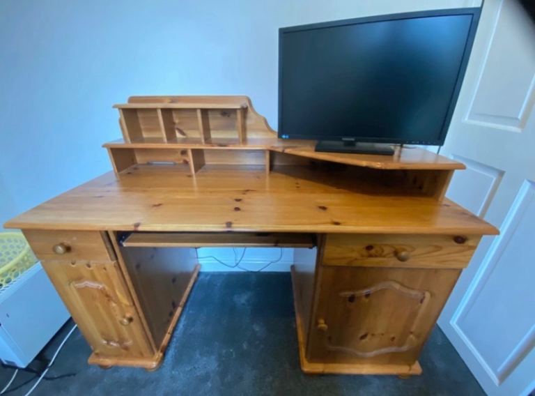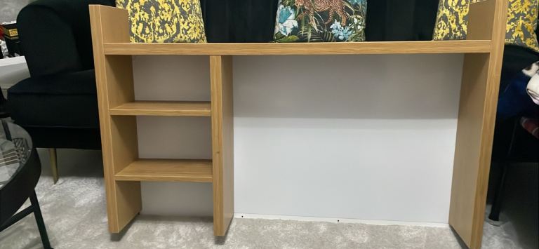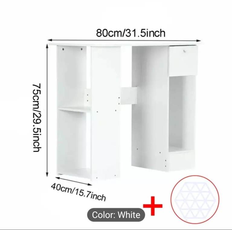 A spacious study deskcombines with storage unit combo which provides ample storage space for laptop, desktop computer, books, and various office essentials.