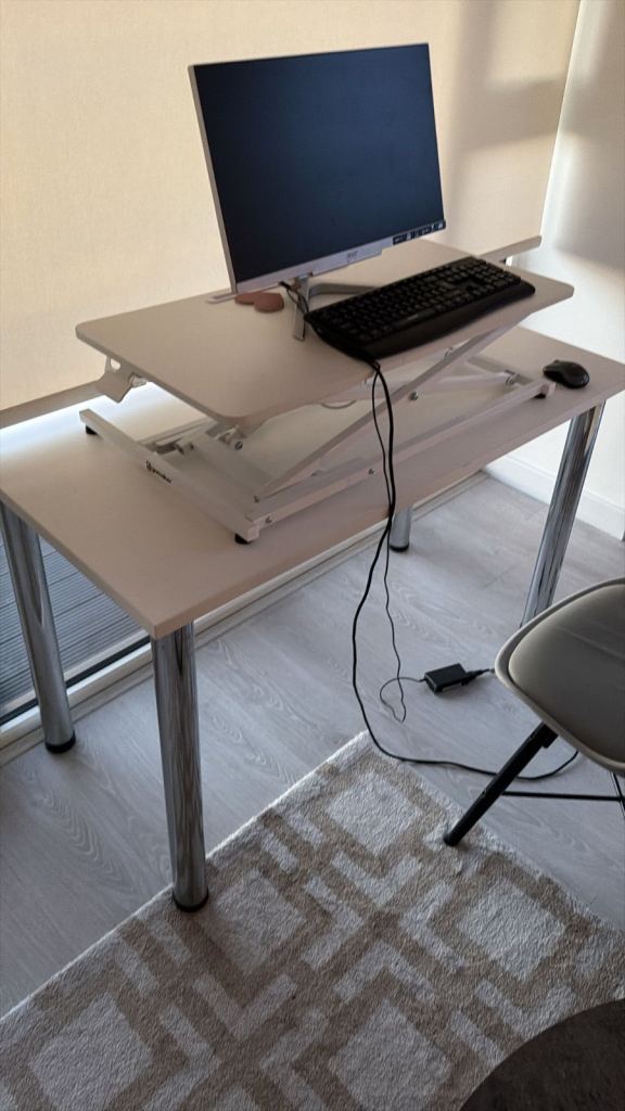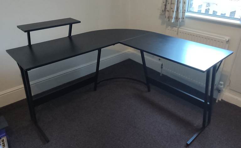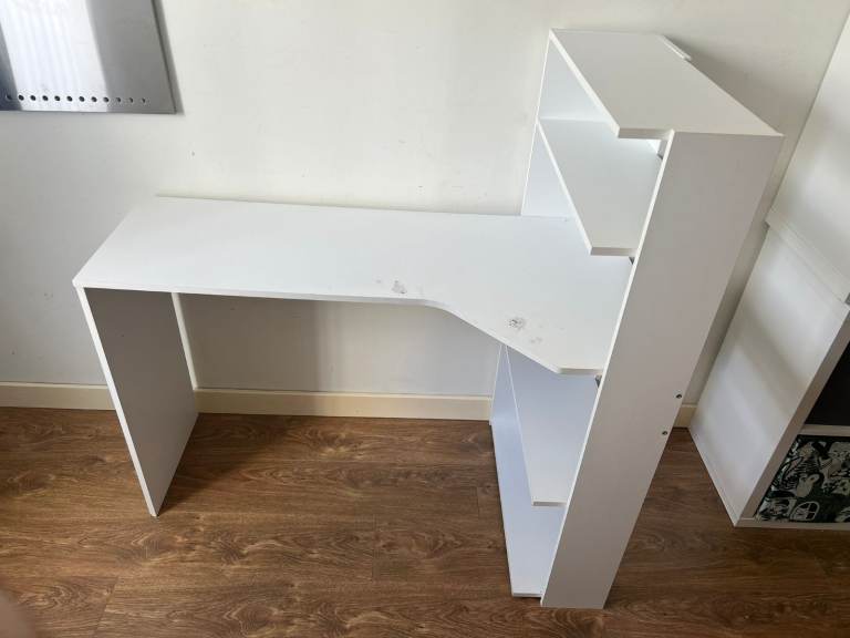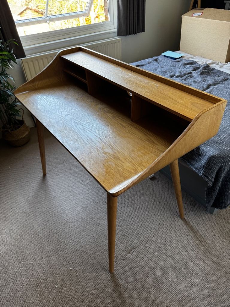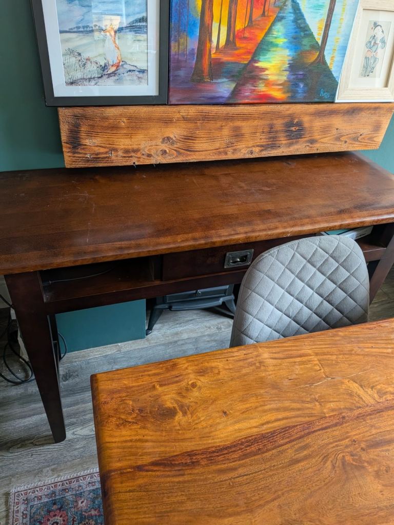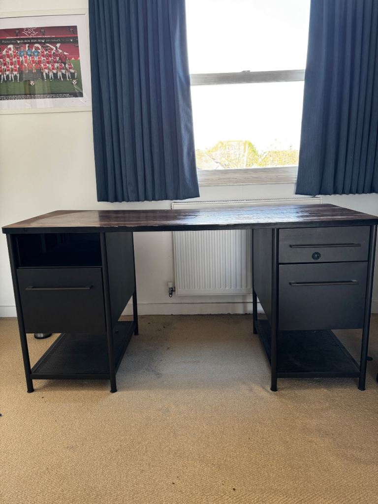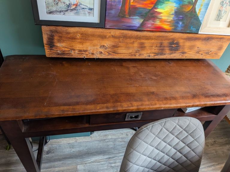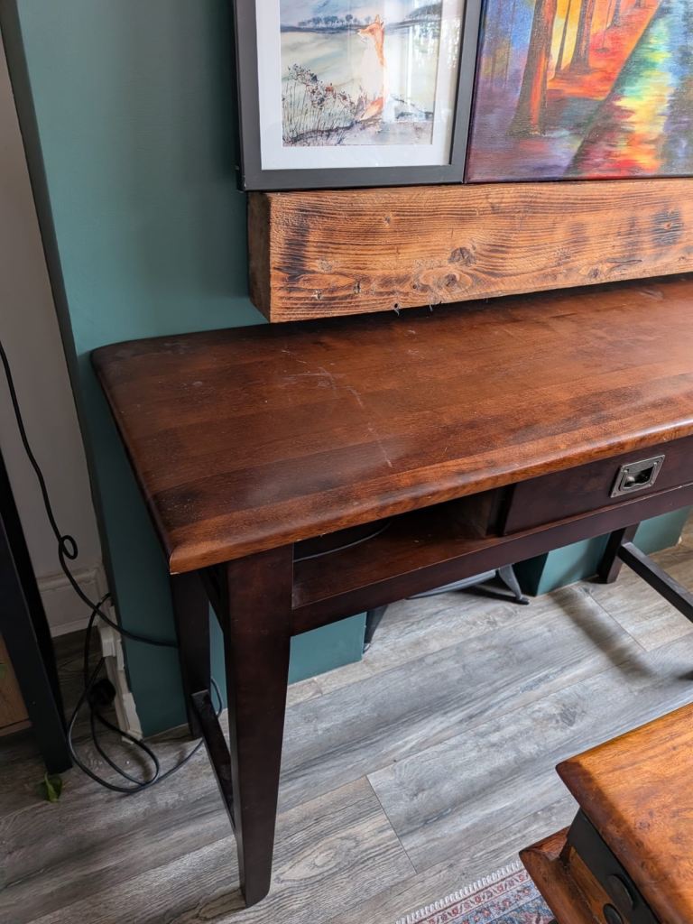 Selling a versatile dark wood desk that could also work perfectly as a hallway console table. It features a spacious top, a central drawer with a rustic metal cup handle, and open storage cubbies on either side—great for hiding away a laptop, notebooks, or paperwork.