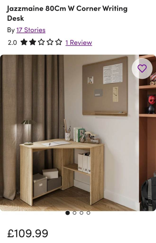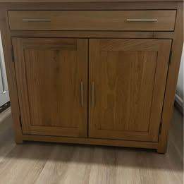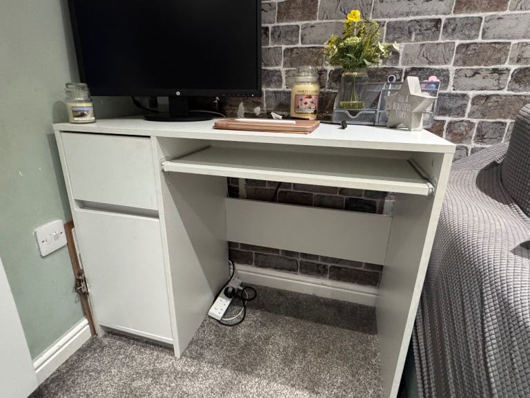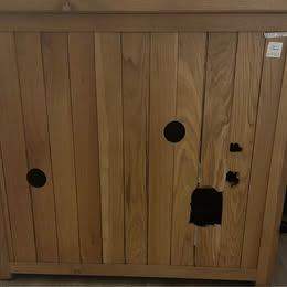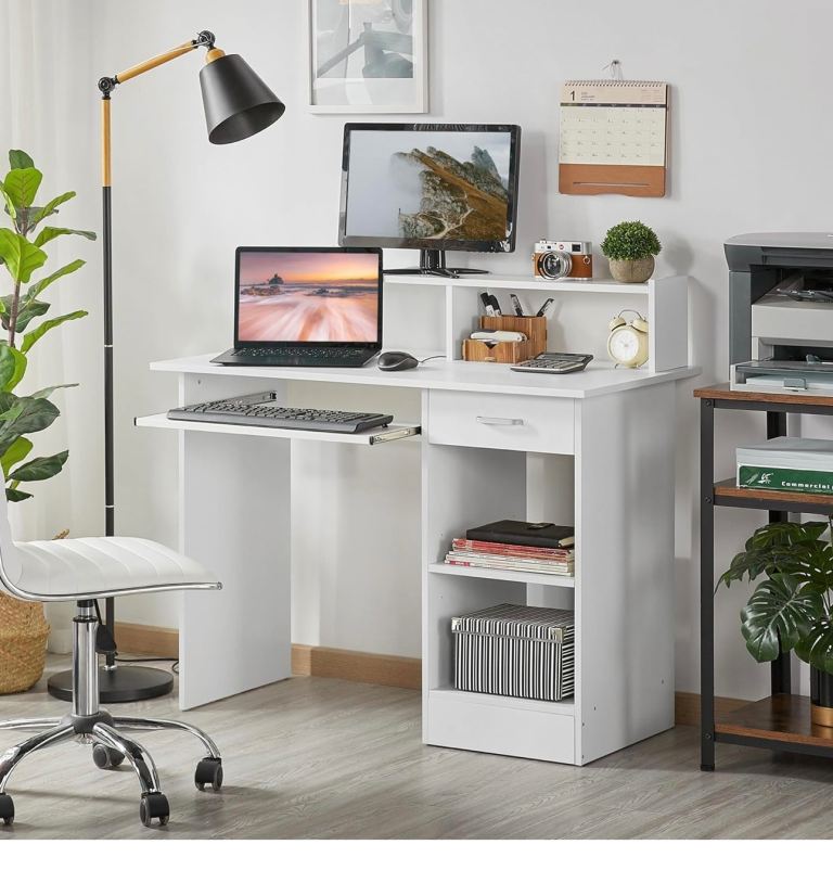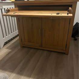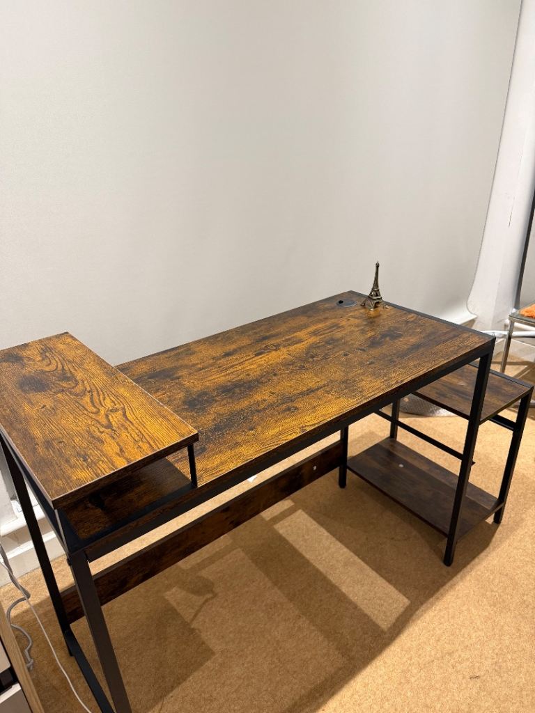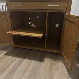Pictures includes a view of the back panel where additional cuts were made to accommodate printer cabling for changes in printers. Price reflects the impact of the cut outs on the appearance, however these are never seen when positioned against a wall.