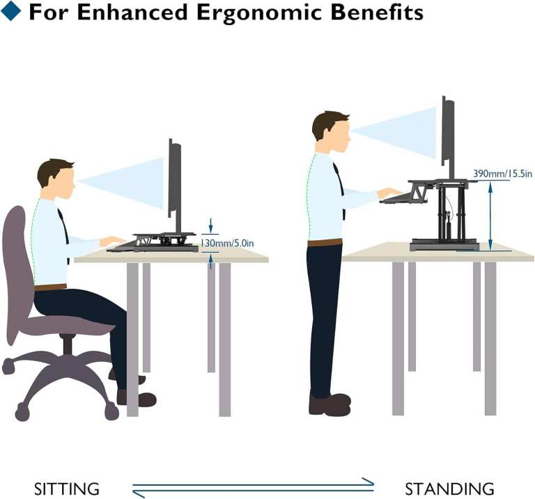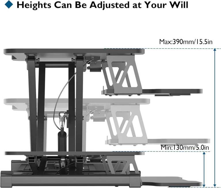 ✅SMOOTH HEIGHT ADJUSTMENT & FLEXIBILITY – Effortlessly transition between sitting and standing with dual squeeze latches and gas spring mechanism; functions as an adjustable desk and adjustable monitor stand, allowing precise positioning for ergonomic workflows and desk that raises up and down functionality without tools or extra parts